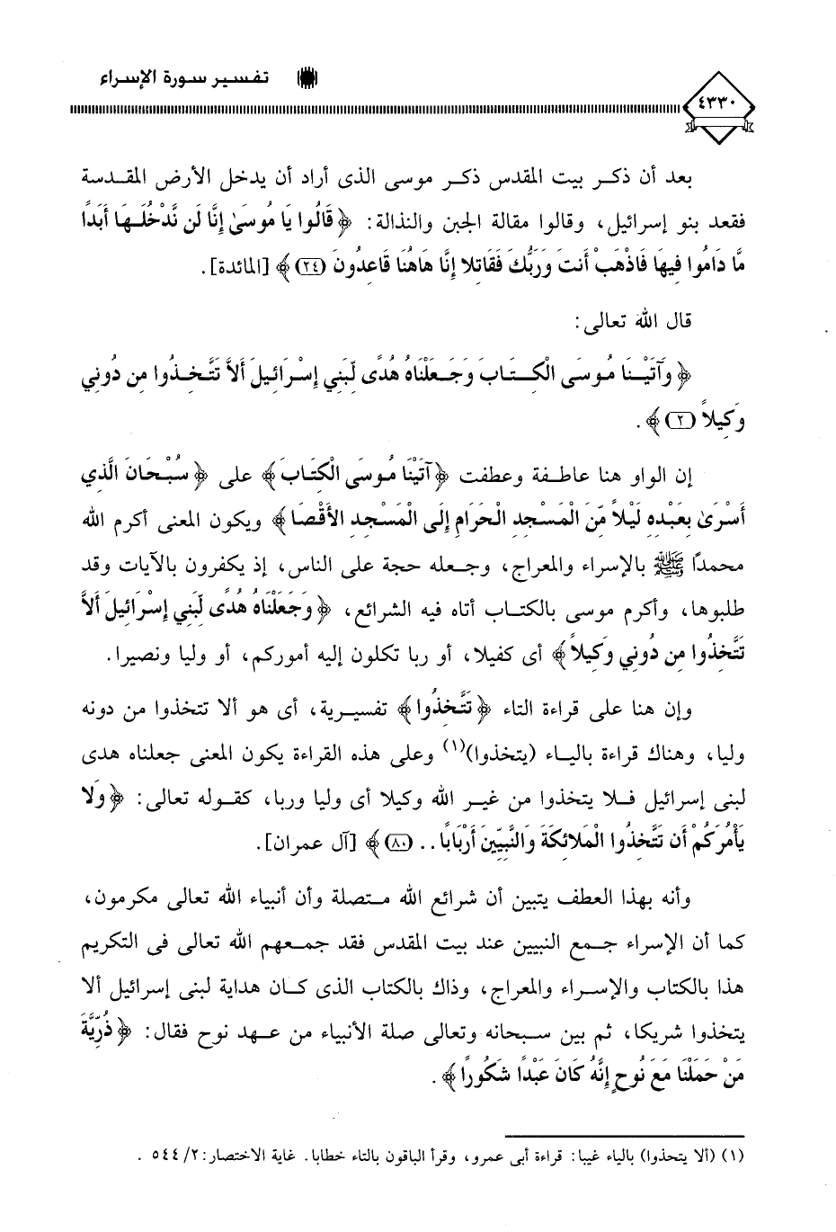 إن الواو هنا عاطفة وعطفت (آتَيْنَا مُوسَى الْكِتَابَ) على (سُبْحَانَ الَّذِي أَسْرَى بِعَبْدِهِ لَيْلًا مِنَ الْمَسْجِدِ الْحَرَامِ إِلَى الْمَسْجِدِ الْأَقْصَا) ويكون المعنى أكرم اللَّه محمدًا - صلى الله عليه وسلم - بالإسراء والمعراج، وجعله حجة على الناس، إذ يكفرون با الآيات وقد طلبوها، وأكرم موسى بالكتاب أتاه فيه الشرائع، (وَجَعَلْنَاهُ هُدًى لِبَنِي إِسْرَائِيلَ أَلَّا تَتَّخِذُوا مِنْ دُونِي وَكِيلًا) أي كفيلا، أو ربًّا تكلون إليه أموركم، أو وليا ونصيرا.