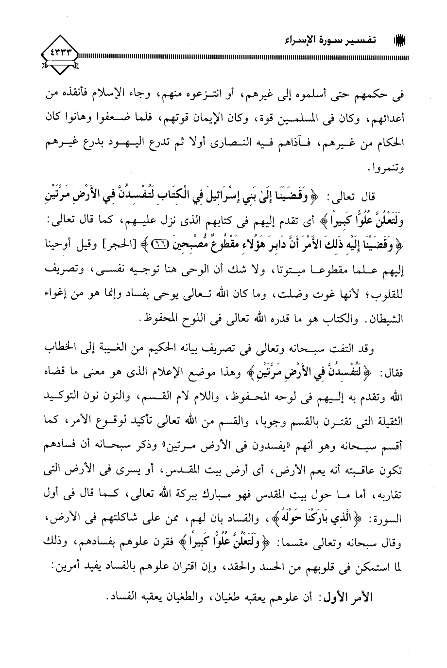 وقد التفت سبحانه وتعالى في تصريف بيانه الحكيم من الغيبة إلى الخطاب فقال: (لَتًفْسِدُنَّ فِي الأَرْض مَرَّتَيْنِ) وهذا موضع الإعلام الذي هو معنى ما قضاه اللَّه وتقدم به إليهم في لوحه المحفوظ، واللام لام القسم، والنون نون التوكيد الثقيلة التي تقترن بالقسم وجوبا، والقسم من اللَّه تعالى تأكيد لوقوع الأمر، كما أقسم سبحانه وهو أنهم " يفسدون في الأرض مرتين " وذكر سبحانه أن فسادهم تكون عاقبته أنه يعم الأرض، أي أرض بيت المقدس، أو يسري في الأرض التي تقاربه، أما ما حول بيت المقدس فهو مبارك ببركة اللَّه تعالى، كما قال في أول السورة: (الَّذِي بَارَكنَا حَوْلَهُ)، والفساد بأن لهم، ممن على شاكلتهم في الأرض، وقال سبحانه وتعالى مقسما: (وَلَتَعْلُنَّ عُلُوًّا كَبِيرًا) فقرن علوهم بفسادهم، وذلك لما استمكن في قلوبهم من الحسد والحقد، وإن اقتران علوهم بالفساد يفيد أمرين: الأمر الأول: أن علوهم يعقبه طغيان، والطغيان يعقبه الفساد.