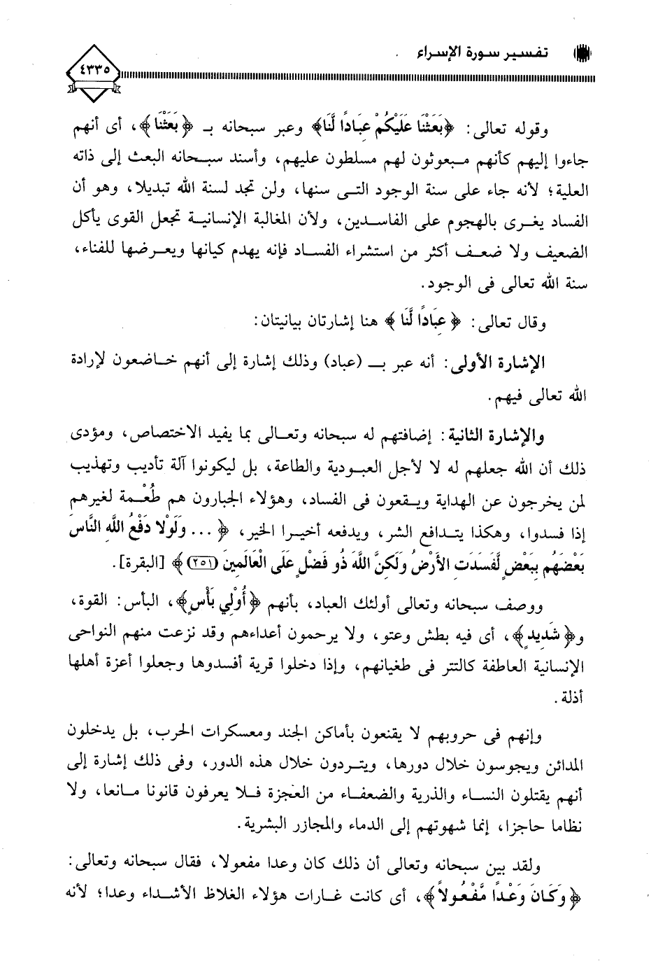 ووصف سبحانه وتعالى أولئك العباد، بأنهم (أُوْلِي بَأسٍ)، الباس: القوة، و (شَدِيدٍ)، أي فيه بطش وعتو، ولا يرحمون أعداءهم وقد نزعت منهم النواحي الإنسانية العاطفة كالتتر في طغيانهم، وإذا دخلوا قرية أفسدوها وجعلوا أعزة أهلها أذلة.