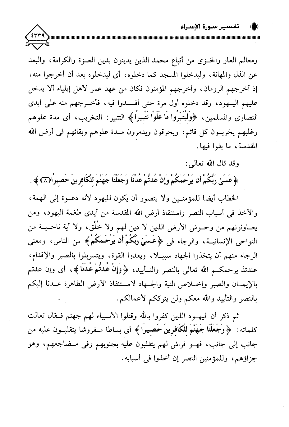 الخطاب أيضا للمؤمنين ولا يتصور أن يكون لليهود لأنه دعوة إلى الهمة، والأخذ في أسباب النصر واستنقاذ أرض الله المقدسة من أيدي طغمة اليهود، ومن يعاونونهم من وحوش الأرض الذين لَا دين لهم ولا خُلُق، ولا أية ناحية من النواحي الإنسانية، والرجاء في (عَسَى رَبُّكُمْ أَن يرْحَمَكُمْ) من الناس، ومعنى الرجاء منهم أن يتخذوا الجهاد سبيلا، ويعدوا القوة، ويتسربلوا بالصبر والإقدام، عندئذ يرحمكم اللَّه تعالى بالنصر والتأييد، (وَإِنْ عُدتُّمْ عُدْنَا)، أي وإن عدتم بالإيمان والصبر وإخلاص النية والجهاد لاستنقاذ الأرض الطاهرة عدنا إليكم بالنصر والتأييد والله معكم ولن يترككم أعمالكم.
