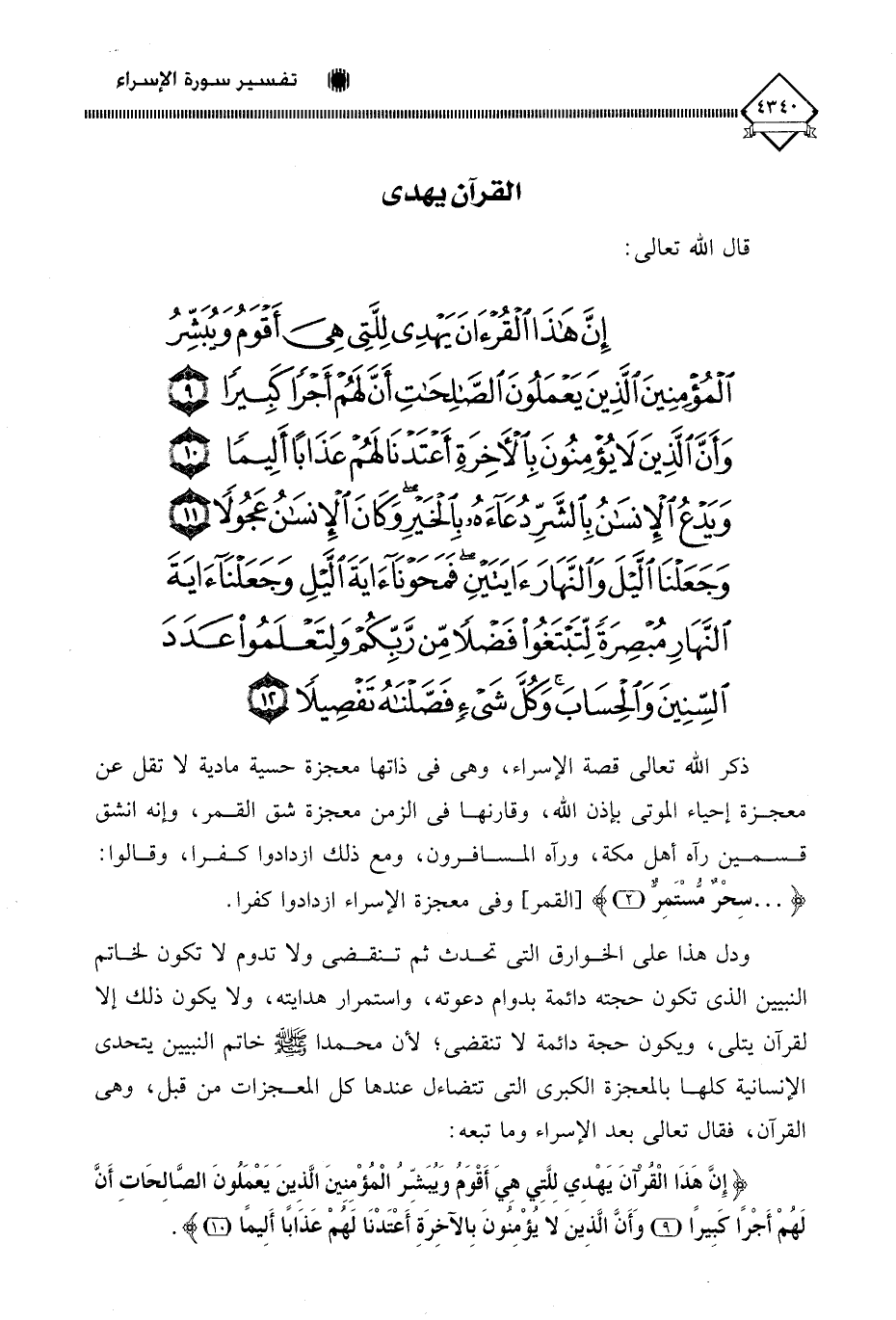 إِنَّ هَذَا الْقُرْآنَ يَهْدِي لِلَّتِي هِيَ أَقْوَمُ وَيُبَشِّرُ الْمُؤْمِنِينَ الَّذِينَ يَعْمَلُونَ الصَّالِحَاتِ أَنَّ لَهُمْ أَجْرًا كَبِيرًا (9) وَأَنَّ الَّذِينَ لَا يُؤْمِنُونَ بِالْآخِرَةِ أَعْتَدْنَا لَهُمْ عَذَابًا أَلِيمًا (10) وَيَدْعُ الْإِنْسَانُ بِالشَّرِّ دُعَاءَهُ بِالْخَيْرِ وَكَانَ الْإِنْسَانُ عَجُولًا (11) وَجَعَلْنَا اللَّيْلَ وَالنَّهَارَ آيَتَيْنِ فَمَحَوْنَا آيَةَ اللَّيْلِ وَجَعَلْنَا آيَةَ النَّهَارِ مُبْصِرَةً لِتَبْتَغُوا فَضْلًا مِنْ رَبِّكُمْ وَلِتَعْلَمُوا عَدَدَ السِّنِينَ وَالْحِسَابَ وَكُلَّ شَيْءٍ فَصَّلْنَاهُ تَفْصِيلًا (12)