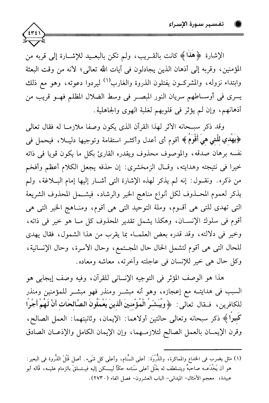 وقد ذكر سبحانه الأثر لهذا القرآن الذي يكون وصفا ملازما له فقال تعالى (يَهْدِي لِلَّتِي هِيَ أَقْوَمُ) أقوم أي أعدل وأكثر استقامة وتوجيها دليلا، فيحمل في نفسه برهان صدقه، والموصوف محذوف ويقدره القارئ بكل ما يكون قويا في ذاته خيرا في نتيجته وهدايته، وقال الزمخشري: إن حذفه يجعل الكلام أعظم وأفخم من ذكره. ونقول: إنه لم يذكر لهذه الإشارة التي أشار إليها إمام البلاغة، ولم يذكر لعموم المحذوف لكل أنواع مناهج الخير والرشاد، فيشمل المحذوف الشريعة التي تهدى للتي هي أقوم، وملة التوحيد التي هي أقوم، ومناهج الخير التي هي أقوم في سلوك الإنسان، وهكذا يشمل تقدير المحذوف كل ما هو خير في ذاته، وخير في دلالته، وقد قدره بعض العلماء بما يقرب من هذا الشمول، فقال يهدي للحال التي هي أقوم لتشمل الحال حال المجتمع، وحال الأسرة، وحال الإنسانية، وكل حال هي خير للإنسان في عاجلته وآخرته، معاشه ومعاده.