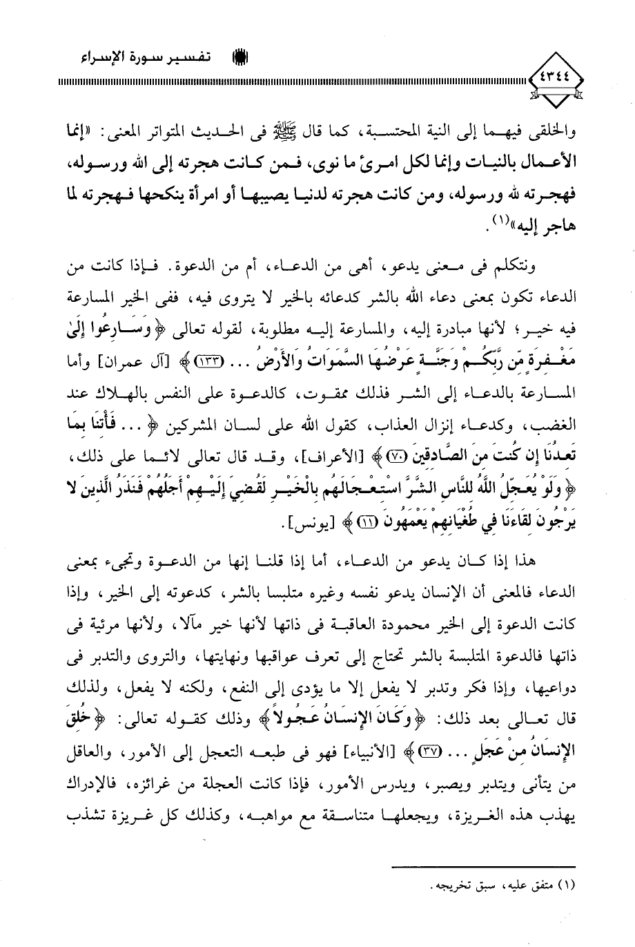 ونتكلم في معنى يدعو، أهي من الدعاء، أم من الدعوة. فإذا كانت من الدعاء تكون بمعنى دعاء اللَّه بالشر كدعائه بالخير لَا يتروى فيه، ففي الخير المسارعة فيه خير؛ لأنها مبادرة إليه، والمسارعة إليه مطلوبة، لقوله تعالى (وَسَارِعُوا إِلَى مَغْفِرَةٍ مِّن رَّبِّكُمْ وَجَنَّةٍ عَرْضُهَا السَّمَاوَاتُ وَالأَرْضُ. . .)، وأما المسارعة بالدعاء إلى الشر فذلك ممقوت، كالدعوة على النفس بالهلاك عند الغضب، وكدعاء إنزال العذاب، كقول الله على لسان المشركين (. . . فَأْتِنَا بِمَا تَعِدُنَا إِن كُنتَ مِنَ الصَّادِقِينَ)، وقد قال تعالى لائما على ذلك، (وَلَوْ يُعَجِّلُ اللَّهُ لِلنَّاسِ الشَّرَّ اسْتِعْجَالَهُمْ بِالْخَيْرِ لَقُضِيَ إِلَيْهِمْ أَجَلُهُمْ فَنَذَرُ الَّذِينَ لَا يَرْجُونَ لِقَاءَنَا فِي طُغْيَانِهِمْ يَعْمَهُونَ (11).