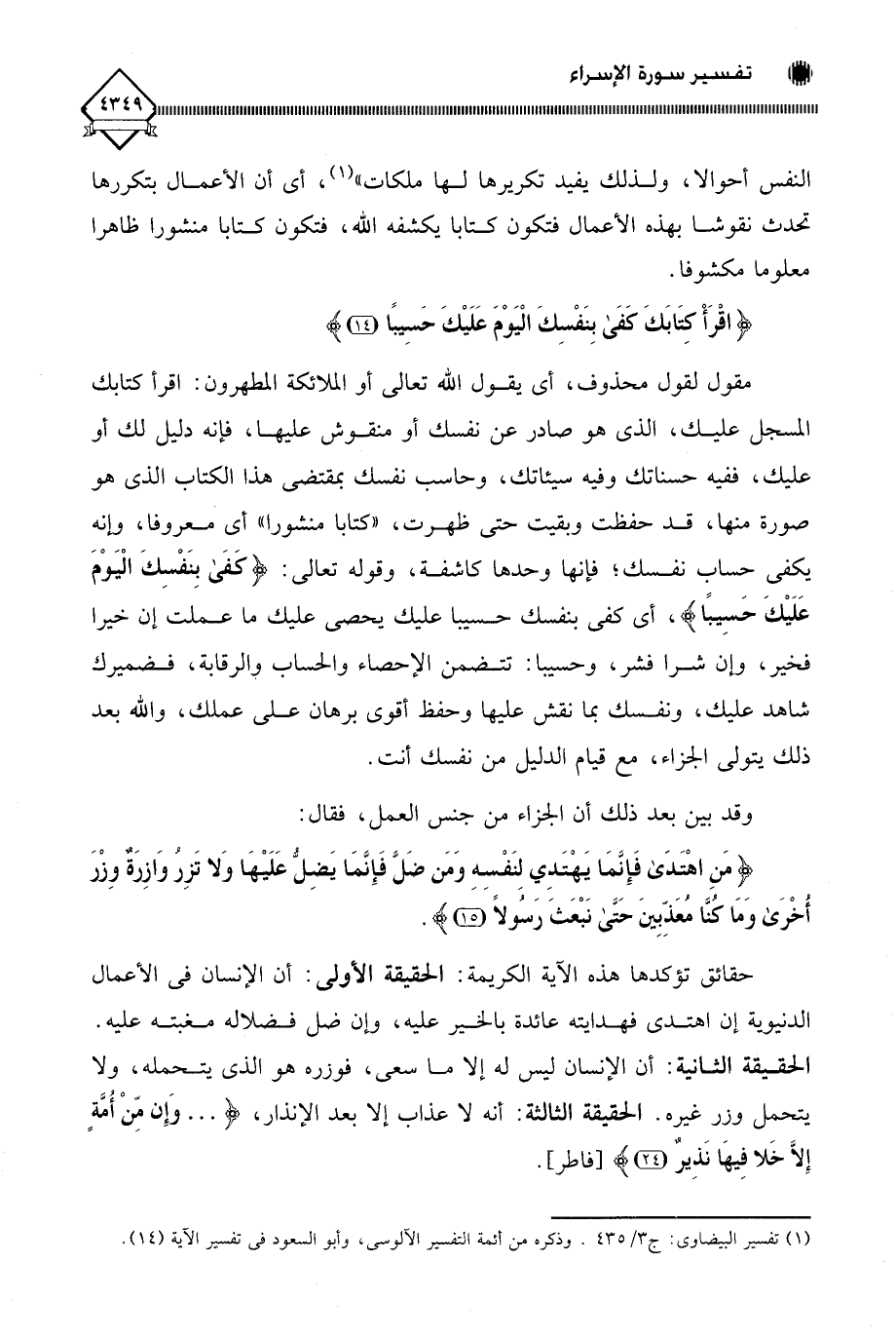 مقول لقول محذوف، أي يقول اللَّه تعالى أو الملائكة المطهرون: اقرأ كتابك المسجل عليك، الذي هو صادر عن نفسك أو منقوش عليها، فإنه دليل لك أو عليك، ففيه حسناتك وفيه سيئاتك، وحاسب نفسك بمقتضى هذا الكتاب الذي هو صورة منها، قد حفظت وبقيت حتى ظهرت، " كتابا منشورا " أي معروفا، وإنه يكفي حساب نفسك؛ فإنها وحدها كاشفة، وقوله تعالى: (كَفَى بِنَفْسكَ الْيَوْمَ عَلَيْكَ حَسِيبًا)، أي كفى بنفسك حسيبا عليك يحصي عليك ما عملت إن خيرا فخير، وإن شرا فشر، وحسيبا؛ تتضمن الإحصاء والحساب والرقابة، فضميرك شاهد عليك، ونفسك بما نقش عليها وحفظ أقوى برهان على عملك، واللَّه بعد ذلك يتولى الجزاء، مع قيام الدليل من نفسك أنت.