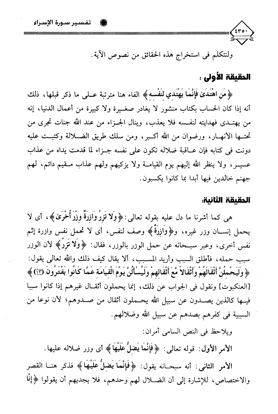 هي كما أشرنا ما دل عليه بقوله تعالى: (وَلا تَزِر وَازِرَةٌ وِزْرَ أُخْرَى)، أي لا يحمل إنسان وزر غيره، و (وَازِرَةٌ) وصف لنفس، أي لَا تحمل نفس وازرة إثم نفس أخرى، وعبر سبحانه عن حمل الوزر بالوزر، فقال: (وَلا تَزِرُ) لأن الوزر سبب حمله، فأطلق السبب وأريد المسبب، ألا يقال كيف ذلك واللَّه تعالى يقول: (وَلَيَحْمِلُنَّ أَثْقَالَهُمْ وَأَثْقَالًا مَعَ أَثْقَالِهِمْ وَلَيُسْأَلُنَّ يَوْمَ الْقِيَامَةِ عَمَّا كَانُوا يَفْتَرُونَ (13)، ونقول في الجواب عن ذلك، إنما يحملون أثقال غيرهم إذا كانوا سببا فيها كالذين يصدون عن سبيل الله يحملون أثقال من صدوهم؛ لأن نوعا من السببية في كفرهم بصدهم عن سبيل اللَّه وضلالهم.