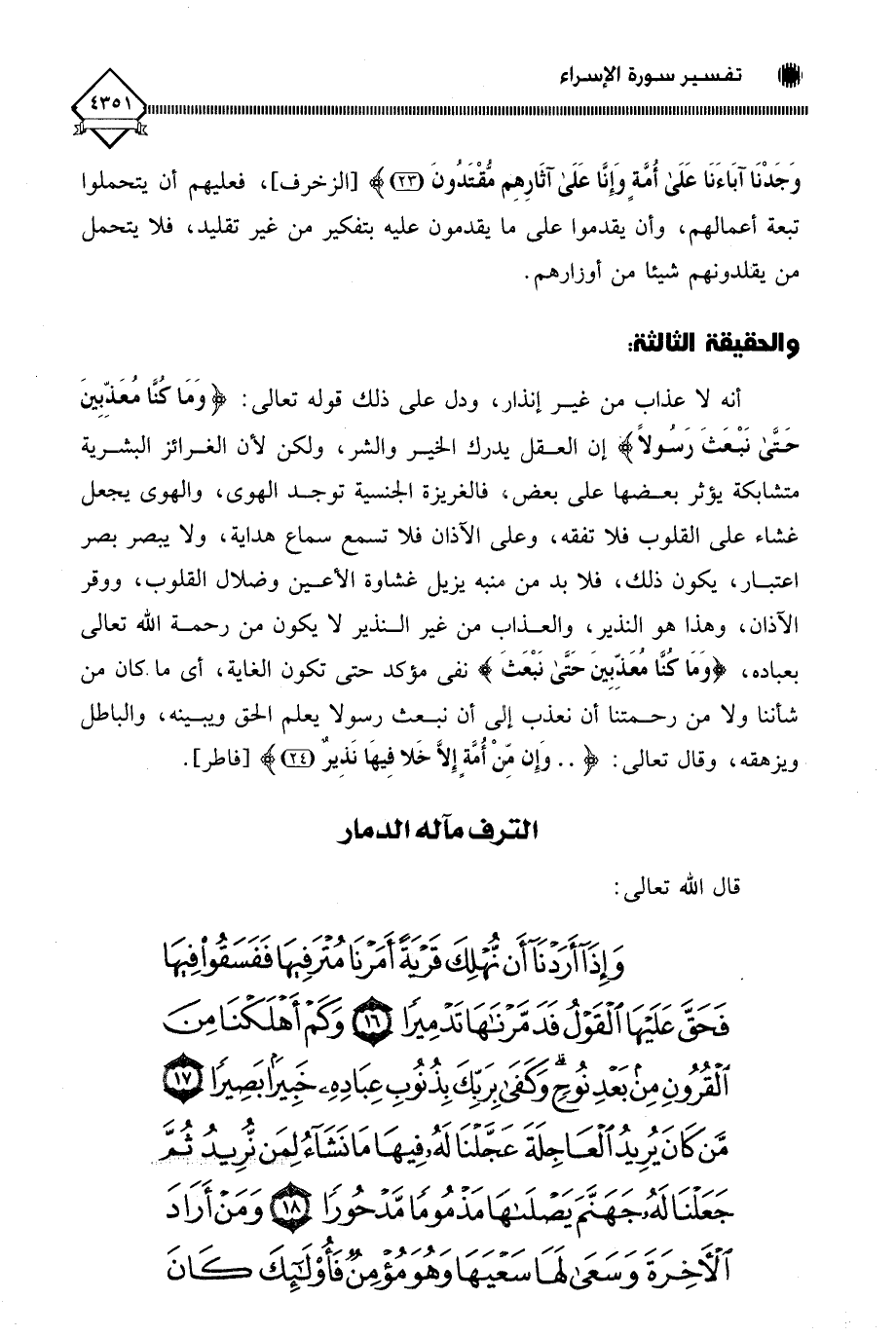 (وَإِذَا أَرَدْنَا أَنْ نُهْلِكَ قَرْيَةً أَمَرْنَا مُتْرَفِيهَا فَفَسَقُوا فِيهَا فَحَقَّ عَلَيْهَا الْقَوْلُ فَدَمَّرْنَاهَا تَدْمِيرًا (16) وَكَمْ أَهْلَكْنَا مِنَ الْقُرُونِ مِنْ بَعْدِ نُوحٍ وَكَفَى بِرَبِّكَ بِذُنُوبِ عِبَادِهِ خَبِيرًا بَصِيرًا (17) مَنْ كَانَ يُرِيدُ الْعَاجِلَةَ عَجَّلْنَا لَهُ فِيهَا مَا نَشَاءُ لِمَنْ نُرِيدُ ثُمَّ جَعَلْنَا لَهُ جَهَنَّمَ يَصْلَاهَا مَذْمُومًا مَدْحُورًا (18) وَمَنْ أَرَادَ الْآخِرَةَ وَسَعَى لَهَا سَعْيَهَا وَهُوَ مُؤْمِنٌ فَأُولَئِكَ كَانَ