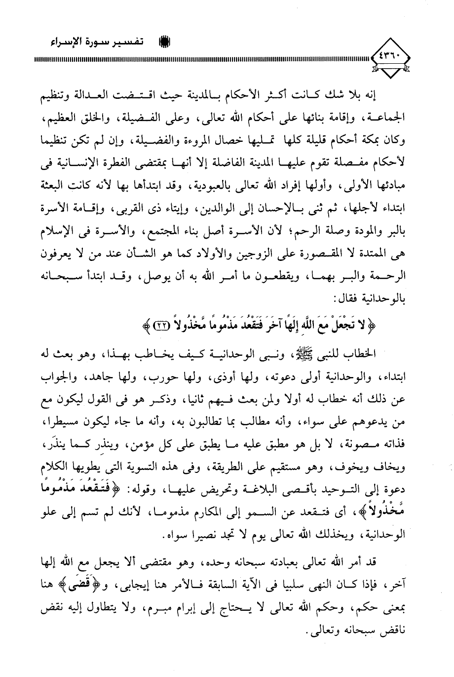 الخطاب للنبي - صلى الله عليه وسلم -، ونبي الوحدانية كيف يخاطب بهذا، وهو بعث له ابتداء، والوحدانية أولى دعوته، ولها أوذي، ولها حورب، ولها جاهد، والجواب عن ذلك أنه خطاب له أولا ولمن بعث فيهم ثانيا، وذكر هو في القول ليكون مع من يدعوهم على سواء، وأنه مطالب بما تطالبون به، وأنه ما جاء ليكون مسيطرا، فذاته مصونة، لَا بل هو مطبق عليه ما يطبق على كل مؤمن، وينذِر كما ينذَر، ويخاف ويخوف، وهو مستقيم على الطريقة، وفي هذه التسوية التي يطويها الكلام دعوة إلى التوحيد بأقصى البلاغة وتحريض عليها، وقوله: (فَتَقْعُدَ مَذْمُومًا مَّخْذُولًا)، أي فتقعد عن السمو إلى المكارم مذموما، لأنك لم تسم إلى علو الوحدانية، ويخذلك اللَّه تعالى يوم لَا تجد نصيرا سواه.