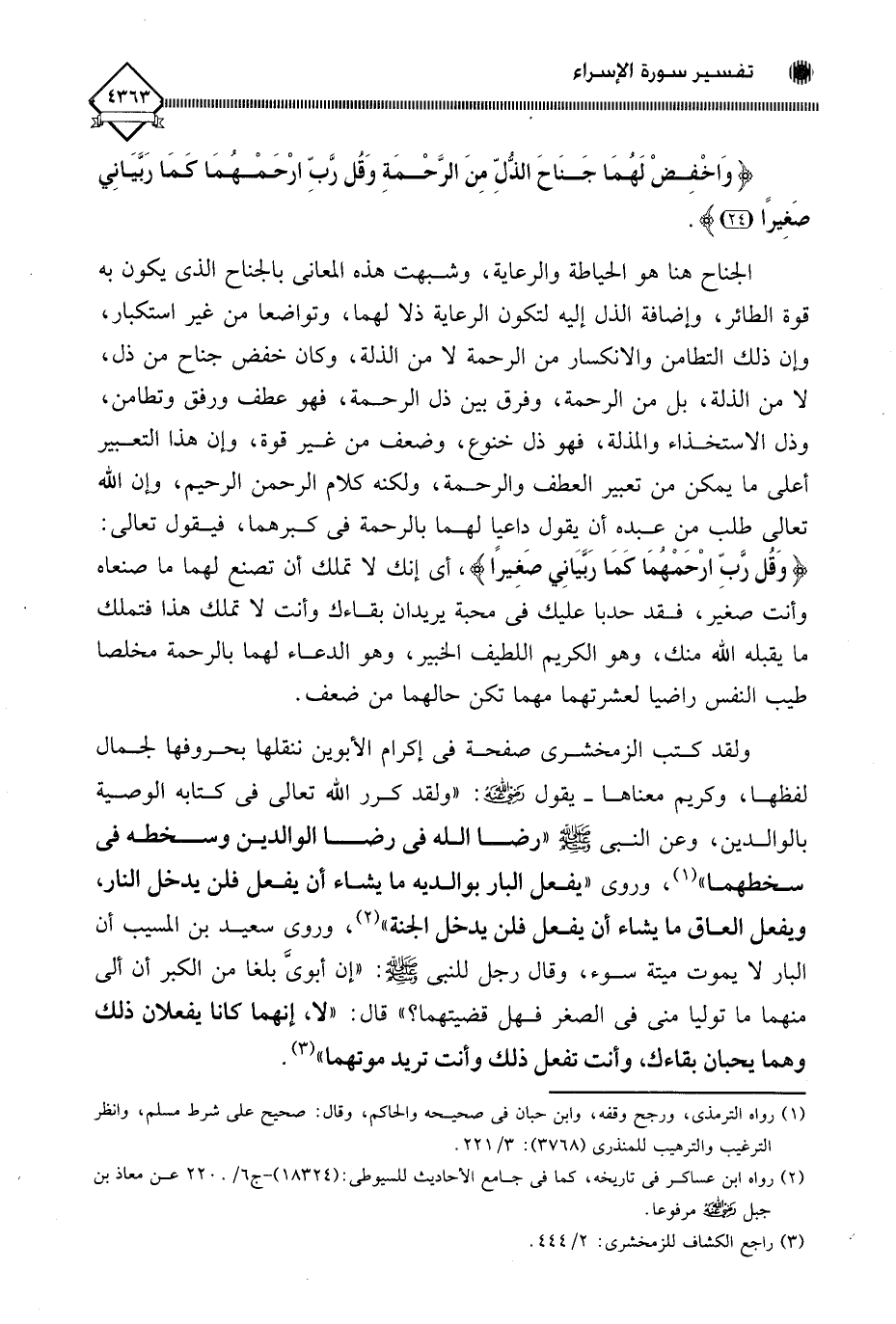 ولقد كتب الزمخشري صفحة في إكرام الأبوين ننقلها بحروفها لجمال لفظها، وكريم معناها - يقول - رضي الله عنه -: " ولقد كرر اللَّه تعالى في كتابه الوصية بالوالدين، وعن النبي - صلى الله عليه وسلم - " رضا الله في رضا الوالدين وسخطه في سحْطهما " (¬1)، وروي " يفعل البار بوالديه ما يشاء أن يفعل فلن يدخل النار، ويفعل العاق ما يشاء أن يفعل فلن يدخل الجنة " (¬2)، وروي سعيد بن المسيب أن البار لَا يموت ميتة سوء، وقال رجل للنبي - صلى الله عليه وسلم -: " إن أبوي بلغا من الكبر أن ألي منهما ما توليا مني في الصغر فهل قضيتهما؟ " قال: " لا، إنهما كانا يفعلان ذلك وهما يحبان بقاءك، وأنت تفعل ذلك وأنت تريد موتهما " (¬3).