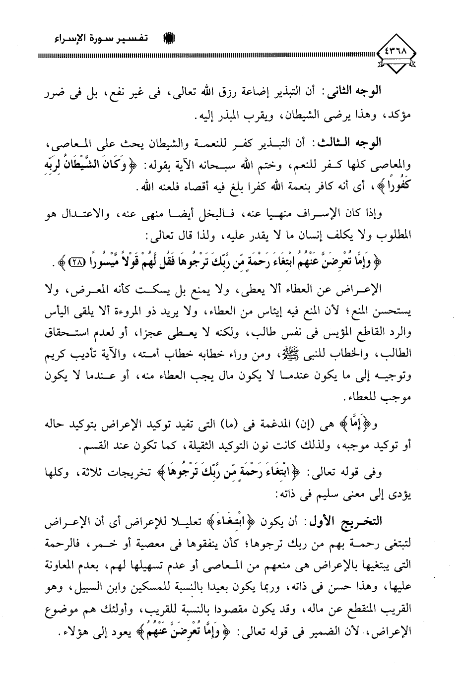 التخريج الأول: أن يكون (ابْتِغَاءَ) تعليلا للإعراض أي أن الإعراض لتبتغي رحمة بهم من ربك ترجوها؛ كأن ينفقوها في معصية أو خمر، فالرحمة التي يبتغيها بالإعراض هي منعهم من المعاصي أو عدم تسهيلها لهم، بعدم المعاونة عليها، وهذا حسن في ذاته، وربما يكون بعيدا بالنسبة للمسكين وابن السبيل، وهو القريب المنقطع عن ماله، وقد يكون مقصودا بالنسبة للقريب، وأولئك هم موضوع الإعراض، - لأن الضمير في قوله تعالى: (وَإِمَّا تُعْرِضَنَّ عَنْهُمُ) يعود إلى هؤلاء.