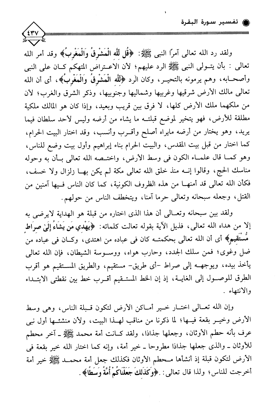 ولقد رد الله تعالى آمرًا النبي - صلى الله عليه وسلم -: (قُل لِّلَّه الْمَشْرِقُ وَالْمَغْرِبُ) وقد أمر الله تعالى: بأن يتولى النبي - صلى الله عليه وسلم - الرد عليهم، لأن الاعتراض المتهكم كان على النبي وأصحابه، وهم يرمونه بالتحير، وكان الرد (لِلَّهِ الْمَشْرِقُ وَالْمَغْرِبُ)، أي أن الله تعالى مالك الأرض شرقيها وغربيها وشماليها وجنوبيها، وذكر الشرق والغرب؛ لأن من ملكهما ملك الأرض كلها، لَا فرق بين قريب وبعيد، وإذا كان هو المالك ملكية مطلقة للأرض، فهو يتخير لموضع قبلته ما يشاء من أرضه وليس لأحد سلطان فيما يريد، وهو يختار من أرضه مايراه أصلح وأقرب وأنسب، وقد اختار البيت الحرام، كما اختار من قبل بيت المقدس، والبيت الحرام بناء إبراهيم وأول بيت وضع للناس، وهو كما قال علماء الكون في وسط الأرض، واختصه الله تعالى بأن به وحوله مناسك الحج، وقالوا إنه منذ خلق الله تعالى مكة لم يكن بها زلزال ولا خسف، فكأن الله تعالى قد أمنها من هذه الظروف الكونية، كما كان الناس فيها آمنين من القتل، وجعله سبحانه وتعالى حرما آمنا، ويتخطف الناس من حولهم.