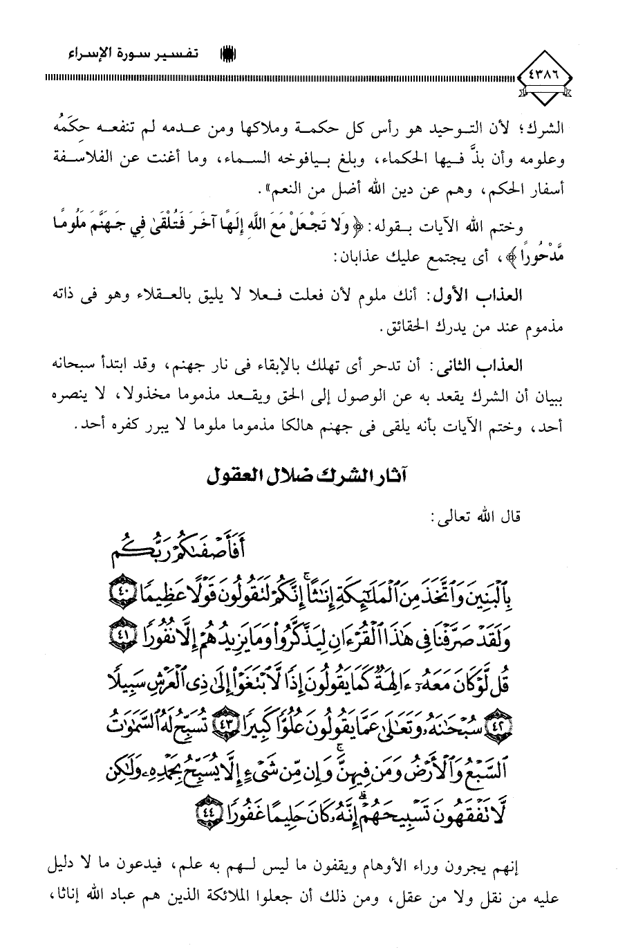 (أَفَأَصْفَاكُمْ رَبُّكُمْ بِالْبَنِينَ وَاتَّخَذَ مِنَ الْمَلَائِكَةِ إِنَاثًا إِنَّكُمْ لَتَقُولُونَ قَوْلًا عَظِيمًا (40) وَلَقَدْ صَرَّفْنَا فِي هَذَا الْقُرْآنِ لِيَذَّكَّرُوا وَمَا يَزِيدُهُمْ إِلَّا نُفُورًا (41) قُلْ لَوْ كَانَ مَعَهُ آلِهَةٌ كَمَا يَقُولُونَ إِذًا لَابْتَغَوْا إِلَى ذِي الْعَرْشِ سَبِيلًا (42) سُبْحَانَهُ وَتَعَالَى عَمَّا يَقُولُونَ عُلُوًّا كَبِيرًا (43) تُسَبِّحُ لَهُ السَّمَاوَاتُ السَّبْعُ وَالْأَرْضُ وَمَنْ فِيهِنَّ وَإِنْ مِنْ شَيْءٍ إِلَّا يُسَبِّحُ بِحَمْدِهِ وَلَكِنْ لَا تَفْقَهُونَ تَسْبِيحَهُمْ إِنَّهُ كَانَ حَلِيمًا غَفُورًا (44)