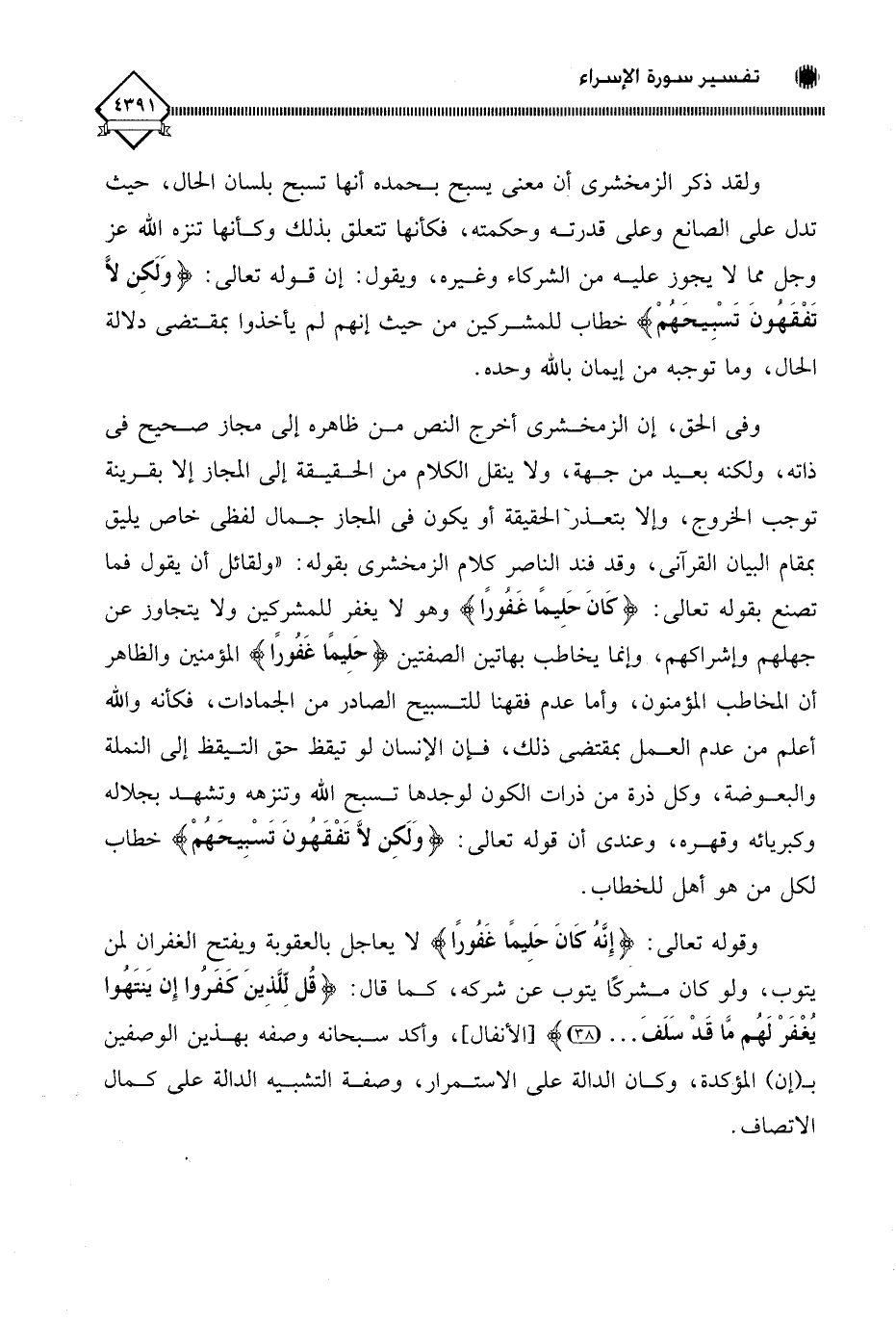 وفى الحق، إن الزمخشري أخرج النص من ظاهره إلى مجاز صحيح في ذاته، ولكنه بعيد من جهة، ولا ينقل الكلام من الحقيقة إلى المجاز إلا بقرينة توجب الخروج، وإلا بتعذر الحقيقة أو يكون في المجاز جمال لفظي خاص يليق بمقام البيان القرآني، وقد فند الناصر كلام الزمخشري بقوله: " ولقائل أن يقول فما تصنع بقوله تعالى: (كَانَ حَلِيمًا غَفُورًا) وهو لَا يغفر للمشركين ولا يتجاوز عن جهلهم وإشراكهم، وإنما يخاطب بهاتين الصفتين (حَلِيمًا غَفُورًا) المؤمنين والظاهر أن المخاطب المؤمنون، وأما عدم فقهنا للتسبيح الصادر من الجمادات، فكأنه والله أعلم من عدم العمل بمقتضى ذلك، فإن الإنسان لو تيقظ حق التيقظ إلى النملة والبعوضة، وكل ذرة من ذرات الكون لوجدها تسبح اللَّه وتنزهه وتشهد بجلاله وكبريائه وقهره، وعندي أن قوله تعالى: (وَلَكِن لَا تَفْقَهُونَ تَسْبيحَهُمْ) خطاب لكل من هو أهل للخطاب.