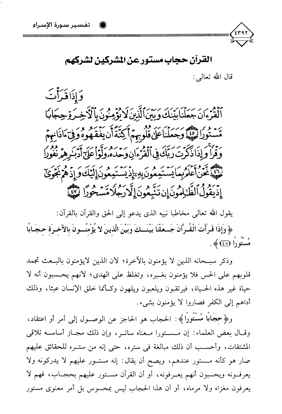 (وَإِذَا قَرَأْتَ الْقُرْآنَ جَعَلْنَا بَيْنَكَ وَبَيْنَ الَّذِينَ لَا يُؤْمِنُونَ بِالْآخِرَةِ حِجَابًا مَسْتُورًا (45) وَجَعَلْنَا عَلَى قُلُوبِهِمْ أَكِنَّةً أَنْ يَفْقَهُوهُ وَفِي آذَانِهِمْ وَقْرًا وَإِذَا ذَكَرْتَ رَبَّكَ فِي الْقُرْآنِ وَحْدَهُ وَلَّوْا عَلَى أَدْبَارِهِمْ نُفُورًا (46) نَحْنُ أَعْلَمُ بِمَا يَسْتَمِعُونَ بِهِ إِذْ يَسْتَمِعُونَ إِلَيْكَ وَإِذْ هُمْ نَجْوَى إِذْ يَقُولُ الظَّالِمُونَ إِنْ تَتَّبِعُونَ إِلَّا رَجُلًا مَسْحُورًا (47)