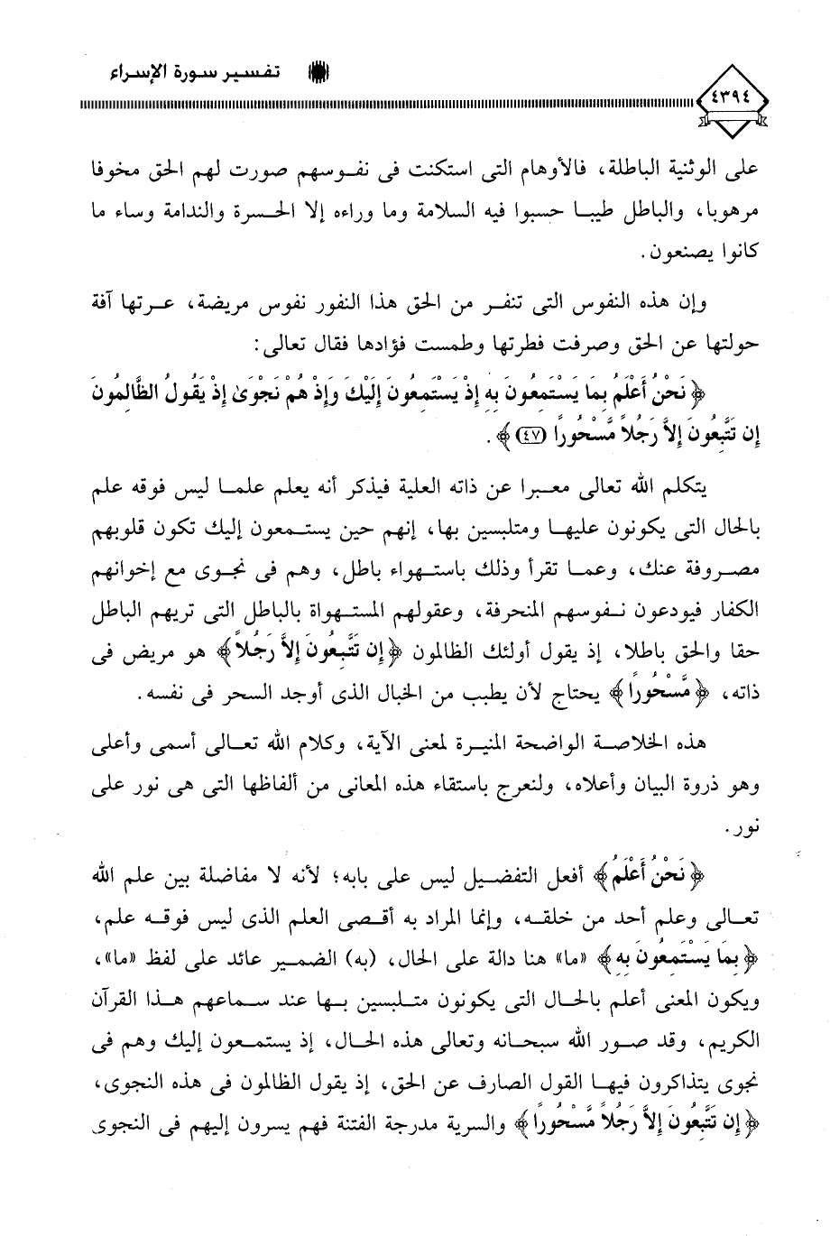 يتكلم اللَّه تعالى معبرا عن ذاته العلية فيذكر أنه يعلم علما ليس فوقه علم يالحال التي يكونون عليها ومتلبسين بها، إنهم حين يستمعون إليك تكون قلوبهم مصروفة عنك، وعما تقرأ وذلك باستهواء باطل، وهم في نجوى مع إخوانهم الكفار فيودعون نفوسهم المنحرفة، وعقولهم المستهواة بالباطل التي تريهم الباطل حقا والحق باطلا، إذ يقول أولئك الظالمون (إِن تَتَّبِعُونَ إِلَّا رَجُلًا) هو مريض في ذاته، (مَّسْحُورًا) يحتاج لأن يطبب من الخبال الذي أوجد السحر في نفسه.
