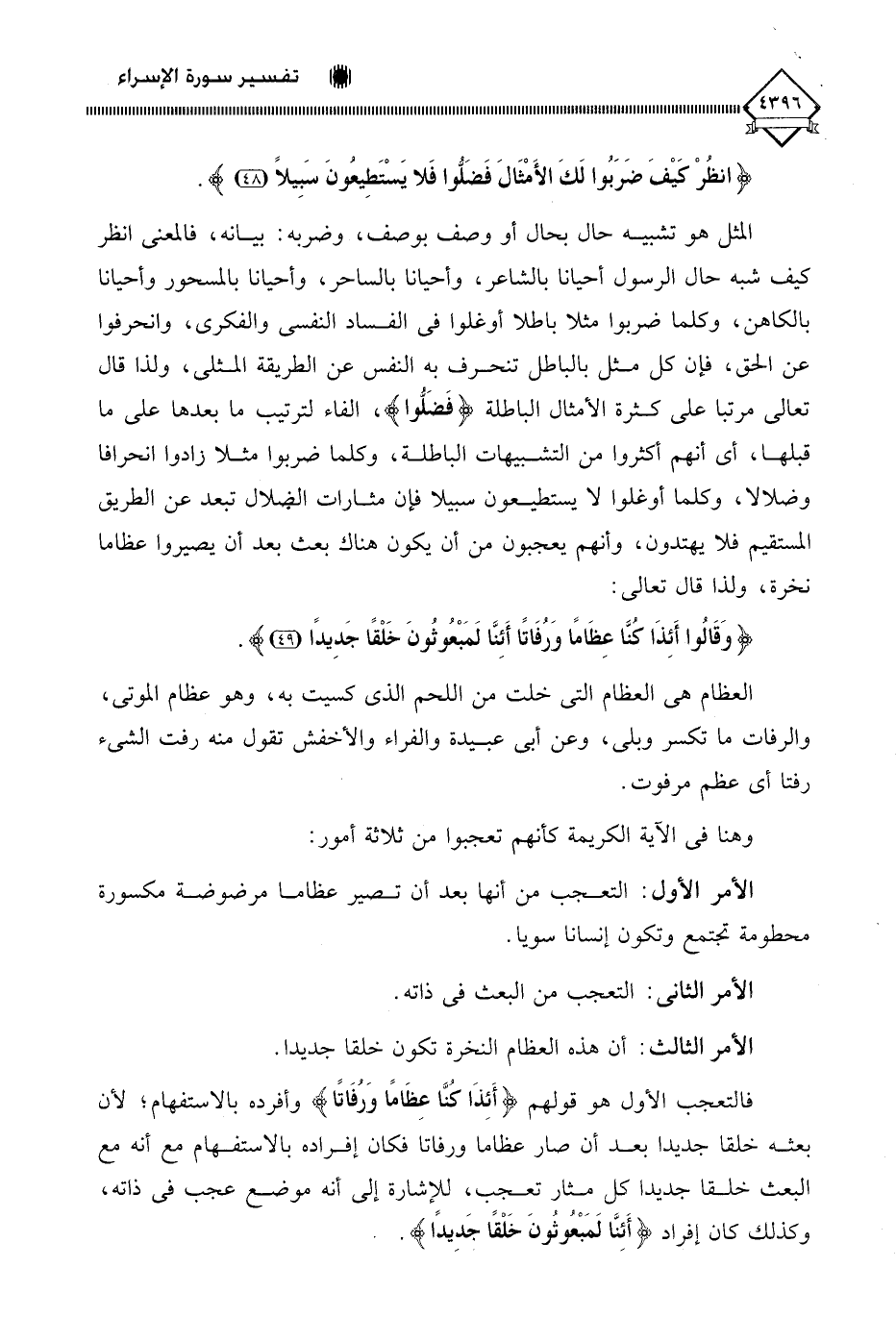 المثل هو تشبيه حال بحال أو وصف بوصف، وضربه: بيانه، فالمعنى انظر كيف شبه حال الرسول أحيانا بالشاعر، وأحيانا بالساحر، وأحيانا بالمسحور وأحيانا بالكاهن، وكلما ضربوا مثلا باطلا أوغلوا في الفساد النفسي والفكري، وانحرفوا عن الحق، فإن كل مثل بالباطل تنحرف به النفس عن الطريقة المثلى، ولذا قال تعالى مرتبا على كثرة الأمثال الباطلة (فَضَلُّوا)، الفاء لترتيب ما بعدها على ما قبلها، أي أنهم أكثروا من التشبيهات الباطلة، وكلما ضربوا مثلا زادوا انحرافا وضلالا، وكلما أوغلوا لَا يستطيعون سبيلا فإن مثارات الضلال تبعد عن الطريق المستقيم فلا يهتدون، وأنهم يعجبون من أن يكون هناك بعث بعد أن يصيروا عظاما نخرة، ولذا قال تعالى: