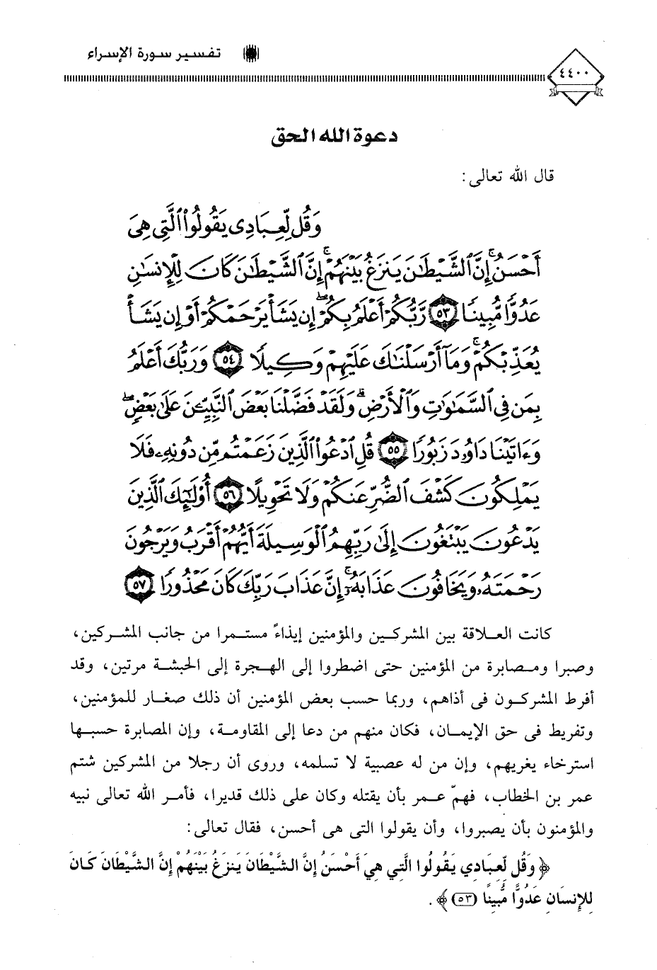 (وَقُلْ لِعِبَادِي يَقُولُوا الَّتِي هِيَ أَحْسَنُ إِنَّ الشَّيْطَانَ يَنْزَغُ بَيْنَهُمْ إِنَّ الشَّيْطَانَ كَانَ لِلْإِنْسَانِ عَدُوًّا مُبِينًا (53) رَبُّكُمْ أَعْلَمُ بِكُمْ إِنْ يَشَأْ يَرْحَمْكُمْ أَوْ إِنْ يَشَأْ يُعَذِّبْكُمْ وَمَا أَرْسَلْنَاكَ عَلَيْهِمْ وَكِيلًا (54) وَرَبُّكَ أَعْلَمُ بِمَنْ فِي السَّمَاوَاتِ وَالْأَرْضِ وَلَقَدْ فَضَّلْنَا بَعْضَ النَّبِيِّينَ عَلَى بَعْضٍ وَآتَيْنَا دَاوُودَ زَبُورًا (55) قُلِ ادْعُوا الَّذِينَ زَعَمْتُمْ مِنْ دُونِهِ فَلَا يَمْلِكُونَ كَشْفَ الضُّرِّ عَنْكُمْ وَلَا تَحْوِيلًا (56) أُولَئِكَ الَّذِينَ يَدْعُونَ يَبْتَغُونَ إِلَى رَبِّهِمُ الْوَسِيلَةَ أَيُّهُمْ أَقْرَبُ وَيَرْجُونَ رَحْمَتَهُ وَيَخَافُونَ عَذَابَهُ إِنَّ عَذَابَ رَبِّكَ كَانَ مَحْذُورًا (57)