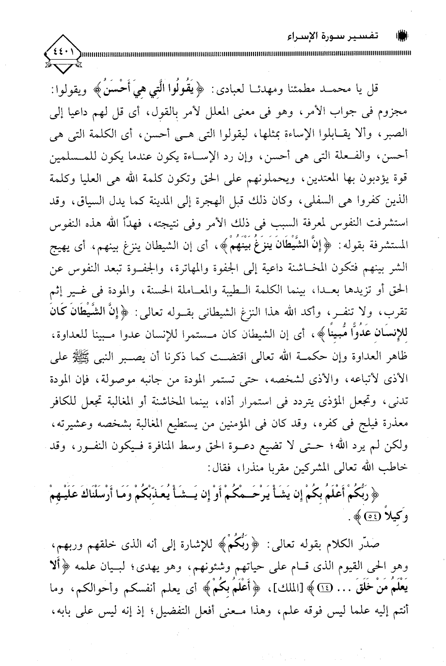 قل يا محمد مطمئنا ومهدئا لعبادي: (يَقُولُوا الَّتِي هِيَ أَحسَنُ) و (يقولوا): مجزوم في جواب الأمر، وهو في معنى المعلل لأمر بالقول، أي قل لهم داعيا إلى الصبر، وألا يقابلوا الإساءة بمثلها، ليقولوا التي هي أحسن، أي الكلمة التي هي أحسن، والفعلة التي هي أحسن، وإن رد الإساءة لكون عندما يكون للمسلمين قوة يؤدبون بها المعتدين، ويحملونهم على الحق وتكون كلمة اللَّه هي العليا وكلمة الذين كفروا هي السفلى، وكان ذلك قبل الهجرة إلى المدينة كما يدل السياق، وقد استشرفت النفوس لمعرفة السبب في ذلك الأمر وفي نتيجته، فهدَّأ اللَّه هذه النفوس المستشرفة بقوله: (إِنَّ الشَّيْطَانَ يَنزَغُ بَيْنَهُمْ)،، أي إن الشيطان ينزغ بينهم، أي يهيج الشر بينهم فتكون المخاشنة داعية إلى الجفوة والمهاترة، والجفوة تبعد النفوس عن الحق أو تزيدها بعدا، بينما الكلمة الطيبة والمعاملة الجسنة، والمودة في غير إثم تقرب، ولا تنفر، وأكد اللَّه هذا النزغ الشيطانى بقوله تعالى: (إِنَّ الشَّيْطَانَ كَانَ لِلْإِنْسَانِ عَدُوًّا مُبِينًا)، أَى إن الشيطان كان مستمرا للإنسان عدوا مبينا للعداوة.
