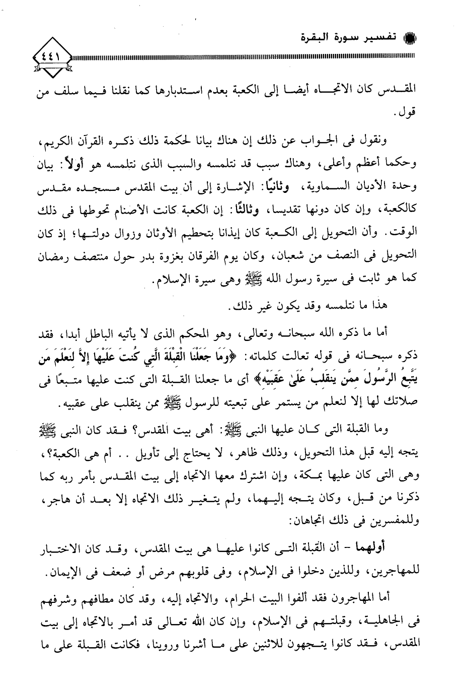 وما القبلة التي كان عليها النبي - صلى الله عليه وسلم -: أهي بيت المقدس؛ فقد كان النبي - صلى الله عليه وسلم - يتجه إليه قبل هذا التحويل، وذلك ظاهر، لَا يحتاج إلى تأويل. . أم هي الكعبة؟، وهي التي كان عليها بمكة، وإن اشترك معها الاتجاه إلى بيت المقدس بأمر ربه كما ذكرنا من قبل، وكان يتجه إليهما، ولم يتغير ذلك الاتجاه إلا بعد أن هاجر، وللمفسرين في ذلك اتجاهان: