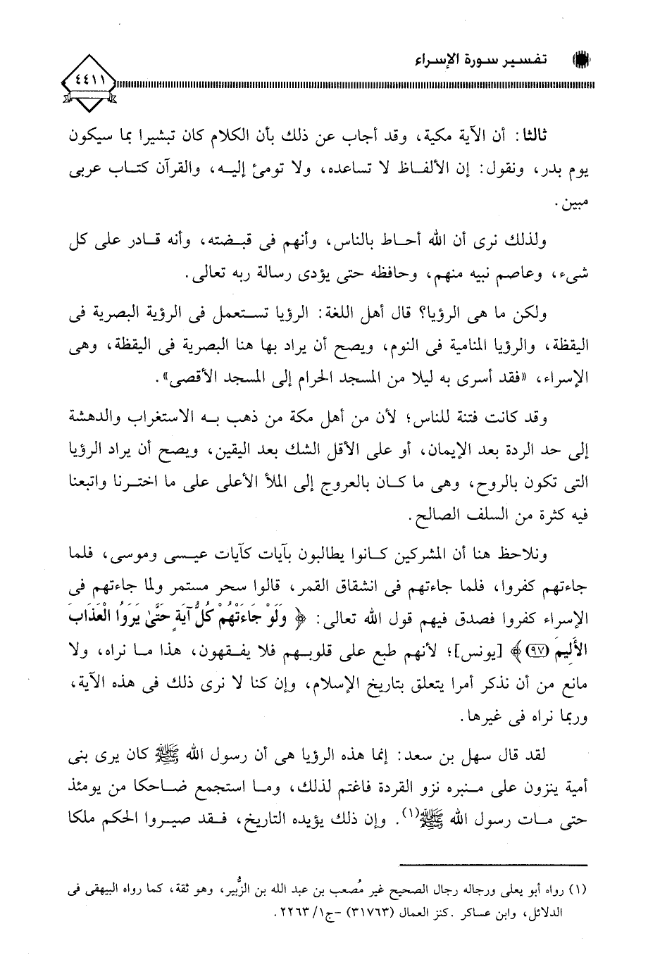 وقد كانت فتنة للناس؛ لأن من أهل مكة من ذهب به الاستغراب والدهشة إلى حد الردة بعد الإيمان، أو على الأقل الشك بعد اليقين، ويصح أن يراد الرؤيا التي تكون بالروح، وهي ما كان بالعروج إلى الملأ الأعلى على ما اخترنا واتبعنا فيه كثرة من السلف الصالح.