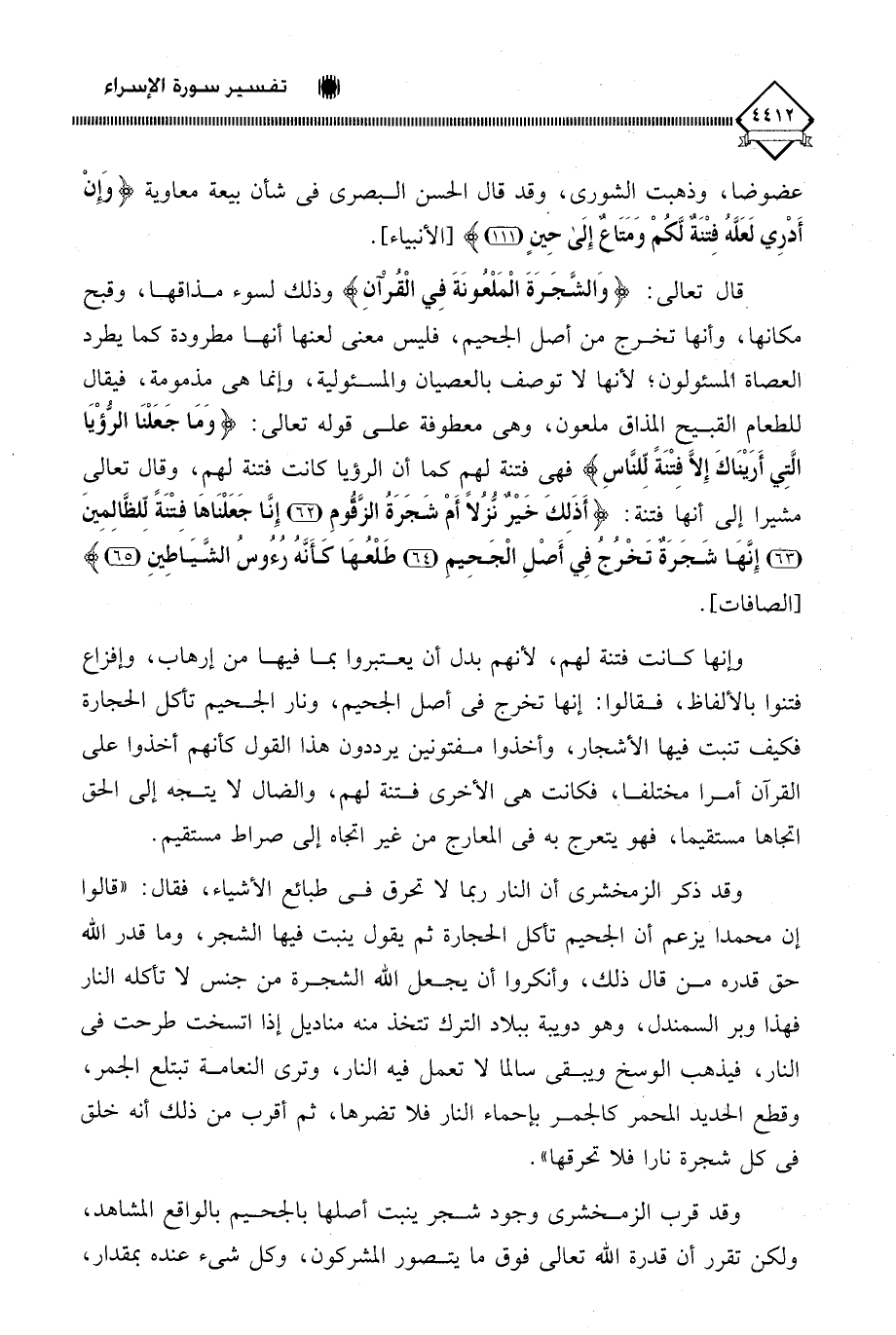 قال تعالى: (وَالشَّجَرَةَ الْمَلْعُونَةَ فِي الْقُرْآنِ) وذلك لسوء مذاقها، وقبح مكانها، وأنها تخرج من أصل الجحيم، فليس معنى لعنها أنها مطرودة كما يطرد العصاة المسئولون، لأنها لَا توصف بالعصيان والمسئولية، وإنما هي مذمومة، فيقال للطعام القبيح المذاق ملعون، وهي معطوفة على قوله تعالى: (وَمَا جَعَلْنَا الرُّؤْيَا الَّتِي أَرَيْنَاكَ إِلَّا فِتْنَةً لِّلنَّاسِ) فهي فتنة لهم كما أن الرؤيا كانت فتنة لهم، وقال تعالى مشيرا إلى أنها فتنة: (أَذَلِكَ خَيْرٌ نُزُلًا أَمْ شَجَرَةُ الزَّقُّومِ (62) إِنَّا جَعَلْنَاهَا فِتْنَةً لِلظَّالِمِينَ (63) إِنَّهَا شَجَرَةٌ تَخْرُجُ فِي أَصْلِ الْجَحِيمِ (64) طَلْعُهَا كَأَنَّهُ رُءُوسُ الشَّيَاطِينِ (65).