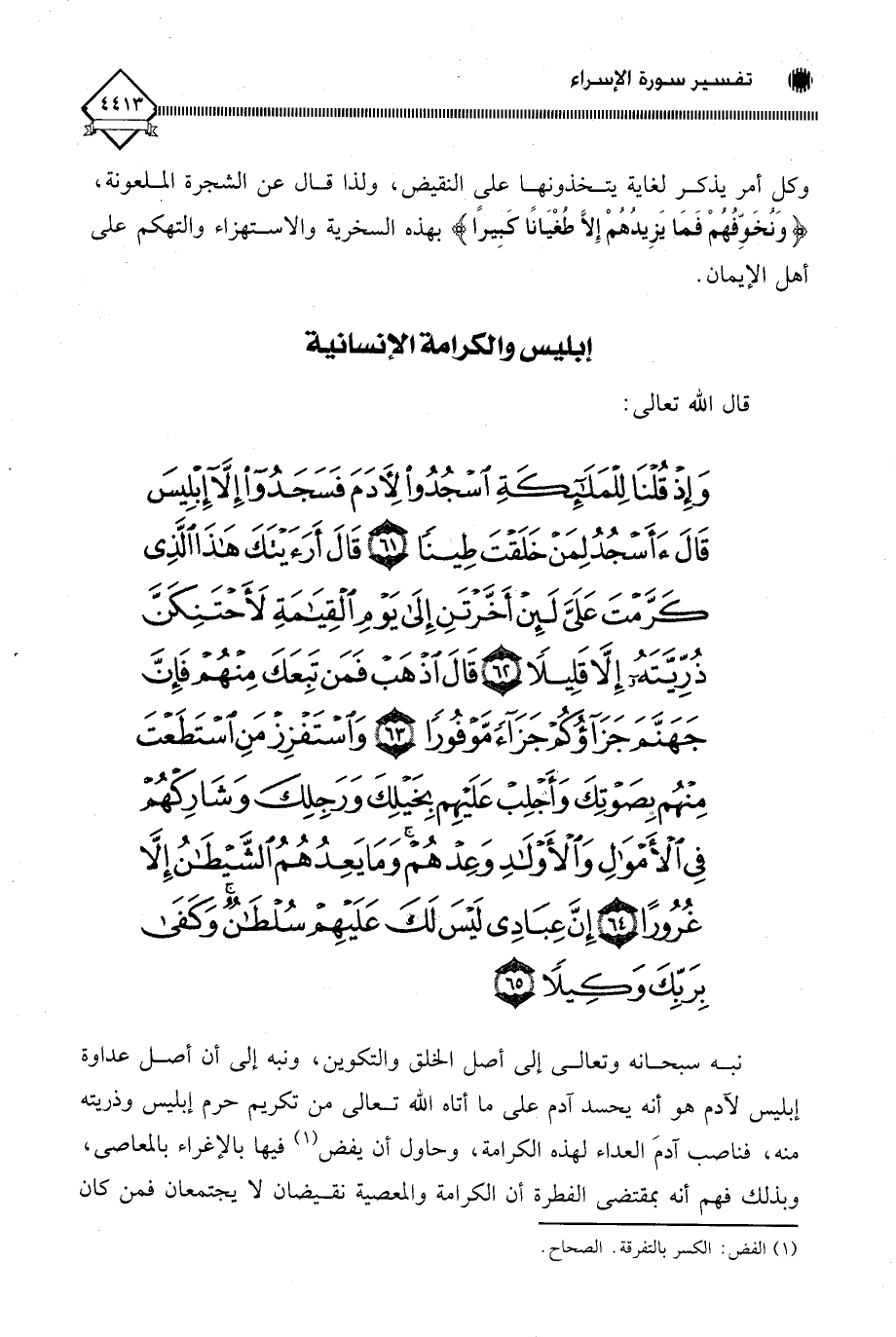 (وَإِذْ قُلْنَا لِلْمَلَائِكَةِ اسْجُدُوا لِآدَمَ فَسَجَدُوا إِلَّا إِبْلِيسَ قَالَ أَأَسْجُدُ لِمَنْ خَلَقْتَ طِينًا (61) قَالَ أَرَأَيْتَكَ هَذَا الَّذِي كَرَّمْتَ عَلَيَّ لَئِنْ أَخَّرْتَنِ إِلَى يَوْمِ الْقِيَامَةِ لَأَحْتَنِكَنَّ ذُرِّيَّتَهُ إِلَّا قَلِيلًا (62) قَالَ اذْهَبْ فَمَنْ تَبِعَكَ مِنْهُمْ فَإِنَّ جَهَنَّمَ جَزَاؤُكُمْ جَزَاءً مَوْفُورًا (63) وَاسْتَفْزِزْ مَنِ اسْتَطَعْتَ مِنْهُمْ بِصَوْتِكَ وَأَجْلِبْ عَلَيْهِمْ بِخَيْلِكَ وَرَجِلِكَ وَشَارِكْهُمْ فِي الْأَمْوَالِ وَالْأَوْلَادِ وَعِدْهُمْ وَمَا يَعِدُهُمُ الشَّيْطَانُ إِلَّا غُرُورًا (64) إِنَّ عِبَادِي لَيْسَ لَكَ عَلَيْهِمْ سُلْطَانٌ وَكَفَى بِرَبِّكَ وَكِيلًا (65)