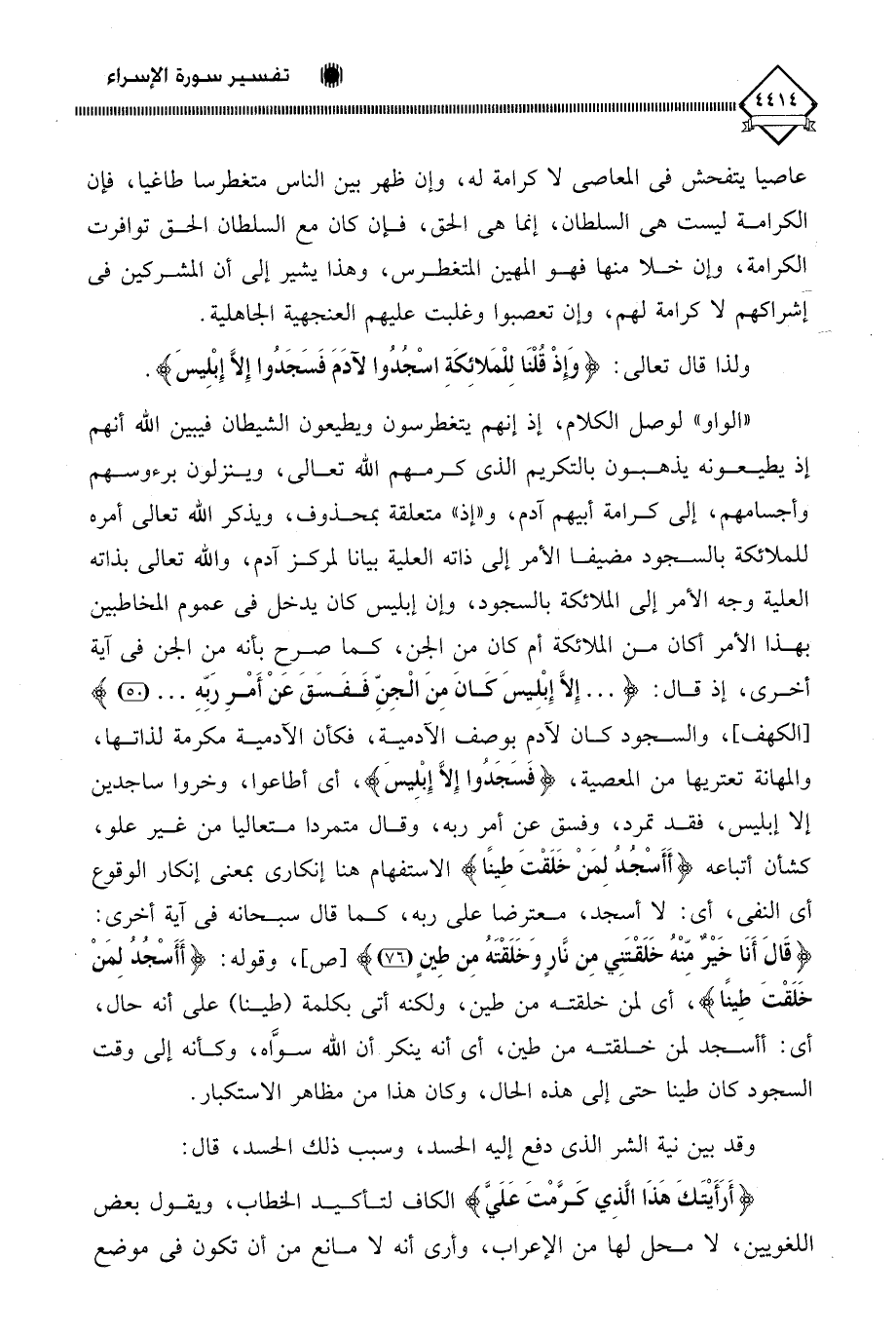 " الواو " لوصل الكلام، إذ إنهم يتغطرسون ويطيعون الشيطان فيبين اللَّه أنهم إذ يطيعونه يذهبون بالتكريم الذي كرمهم اللَّه تعالى، وينزلون برءوسهم وأجسامهم، إلى كرامة أبيهم آدم، و " إذ " متعلقة بمحذوف، ويذكر اللَّه تعالى أمره للملائكة بالسجود مضيفا الأمر إلى ذاته العلية بيانا لمركز آدم، واللَّه تعالى بذاته العلية وجه الأمر إلى الملائكة بالسجود، وإن إبليس كان يدخل في عموم المخاطبين بهذا الأمر أكان من الملائكة أم كان من الجن، كما صرحِ بأنه من الجن في آية أخرى، إذ قال: (. . . إِلَّا إِبْلِيسَ كَانَ مِنَ الْجِنِّ فَفَسَقَ عَنْ أَمْرِ رَبِّهِ. . .)، والسجود كان لآدم بوصف الآدمية، فكأن الآدمية مكرمة لذاتها، والمهانة تعتريها من المعصية، (فَسَجَدُوا إِلَّا إِبْلِيسَ)، أي أطاعوا، وخروا ساجدين إِلَّا إِبْلِيسَ، فقد تمرد، وفسق عن أمر ربه، وقال متمردا متعاليا من غير علو، كشأن أتباعه (أَأَسْجُدُ لِمَنْ خَلَقْتَ) الاستفهام هنا إنكاري بمعنى إنكار الوقوع أي النفي، أي: لَا أسجد، معترضا على ربه، كما قال سبحانه في آية أخرى: (قَالَ أَنَا خَيْرٌ منْهُ خَلَقْتَنِي مِن نَّارٍ وَخَلَقْتَهُ مِن طِينٍ)، وقوله: (أَأَسْجُدُ لِمَنْ خَلَقْتَ طِينًا)، أي لمن خلقته من طين، ولكنه أتى بكلمة (طينا) على أنه حال، أي: أأسجد لمن خلقته من طين، أي أنه ينكر أن اللَّه سوَّاه، وكأنه إلى وقت السجود كان طينا حتى إلى هذه الحال، وكان هذا من مظاهر الاستكبار.