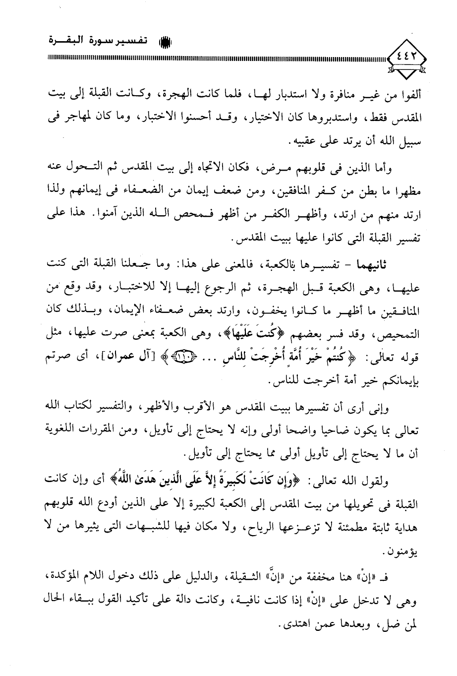 ولقول الله تعالى: (وَإِن كَانَتْ لَكَبِيرَةً إِلَّا عَلَى الَّذِينَ هَدَى اللَّهُ) أي وإن كانت القبلة في تحويلها من بيت المقدس إلى الكعبة لكبيرة إلا على الذين أودع الله قلوبهم هداية ثابتة مطمئنة لَا تزعزعها الرياح، ولا مكان فيها للشبهات التي يثيرها من لا يؤمنون.