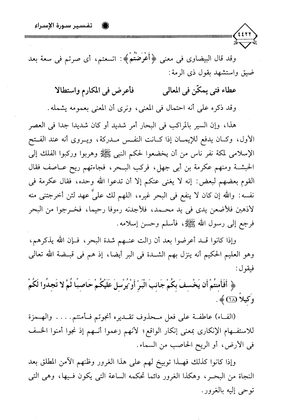 هذا، وإن السير بالمراكب في البحار أمر شديد أو كان شديدا جدا في العصر الأول، وكان يدفع للإيمان إذا كانت النفس مدركة، ويروى أنه عند الفتح الإسلامي لمكة نفر ناس من أن يخضعوا لحكم النبي - صلى الله عليه وسلم - وهربوا وركبوا الفلك إلى الحبشة ومنهم عكرمة بن أبي جهل، فركب البحر، فجاءتهم ريح عاصف فقال القوم بعضهم لبعض: إنه لَا يغني عنكم إلا أن تدعوا اللَّه وحده، فقال عكرمة في نفسه: واللَّه إن كان لَا ينفع في البحر غيره، اللهم لك على عهد لئن أخرجتني منه لأذهبن فلأضعن يدي في يد محمد، فلأجدنه رءوفًا رحيما، فخرجوا من البحر فرجع إلى رسول اللَّه - صلى الله عليه وسلم -، فأسلم وحسن إسلامه.