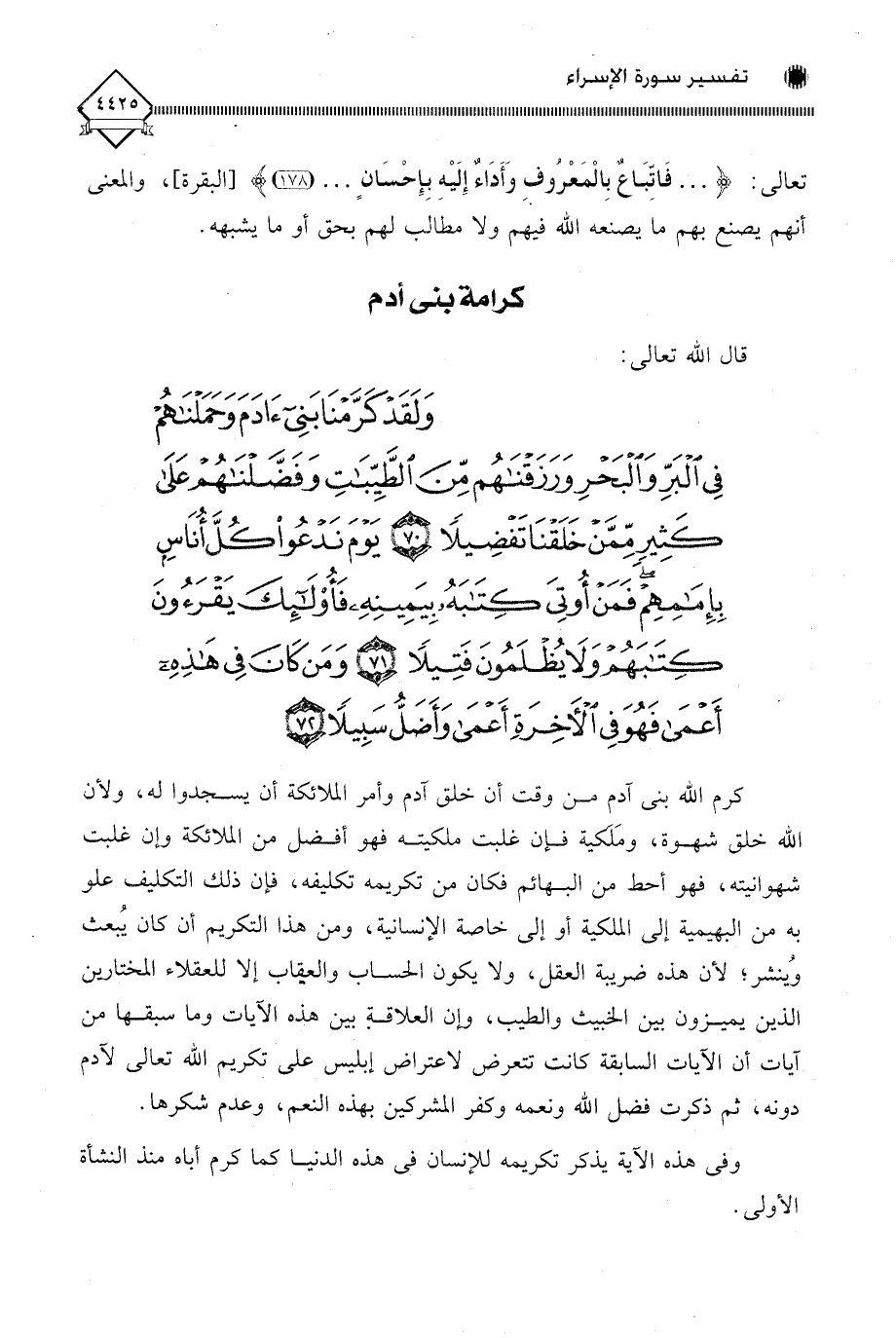 (وَلَقَدْ كَرَّمْنَا بَنِي آدَمَ وَحَمَلْنَاهُمْ فِي الْبَرِّ وَالْبَحْرِ وَرَزَقْنَاهُمْ مِنَ الطَّيِّبَاتِ وَفَضَّلْنَاهُمْ عَلَى كَثِيرٍ مِمَّنْ خَلَقْنَا تَفْضِيلًا (70) يَوْمَ نَدْعُو كُلَّ أُنَاسٍ بِإِمَامِهِمْ فَمَنْ أُوتِيَ كِتَابَهُ بِيَمِينِهِ فَأُولَئِكَ يَقْرَءُونَ كِتَابَهُمْ وَلَا يُظْلَمُونَ فَتِيلًا (71) وَمَنْ كَانَ فِي هَذِهِ أَعْمَى فَهُوَ فِي الْآخِرَةِ أَعْمَى وَأَضَلُّ سَبِيلًا (72)