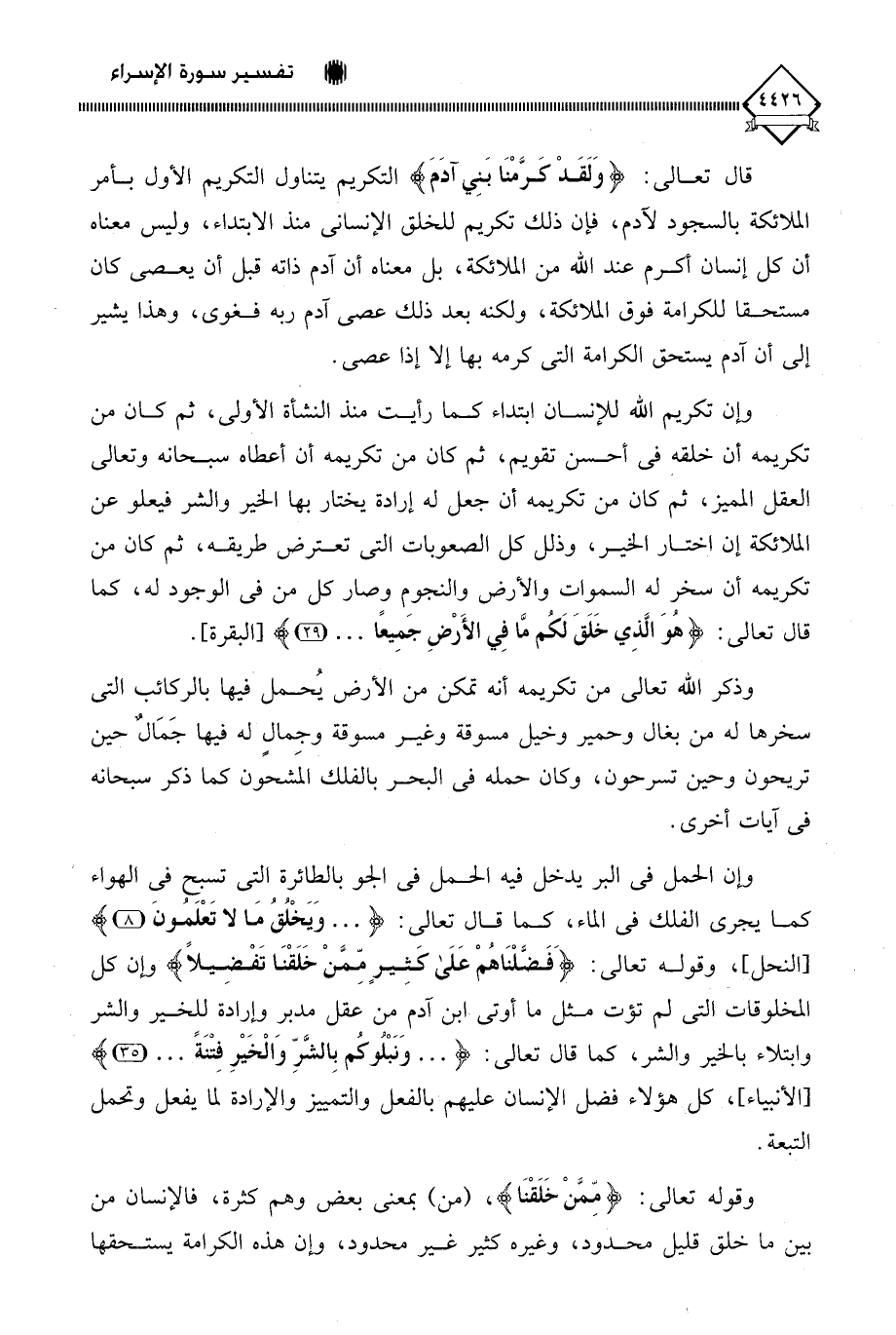 وإن الحمل في البر يدخل فيه الحمل في الجو بالطائرة التي تسبح في الهواء كما يجري الفلك في الماء، كما قال تعالى: (. . . وَيَخْلُقُ مَا لا تَعْلَمونَ)، وقوله تعالى: (فَضَّلْنَاهُمْ عَلَى كَثِيرٍ ممَّنْ خَلَقْنَا تَفْضِيلًا) وإن كل المخلوقات التي لم تؤت مثل ما أوتي ابن آدم من عقل مدبر وإرادة للخير والشر وابتلاء بالخير والشر، كما قال تعالى: (. . . وَنَبْلُوكُم بِالشَّرِّ وَالْخَيْرِ فِتنَةً. . .)، كل هؤلاء فضل الإنسان عليهم بالفعل والتمييز والإرادة لما يفعل وتحمل التبعة.