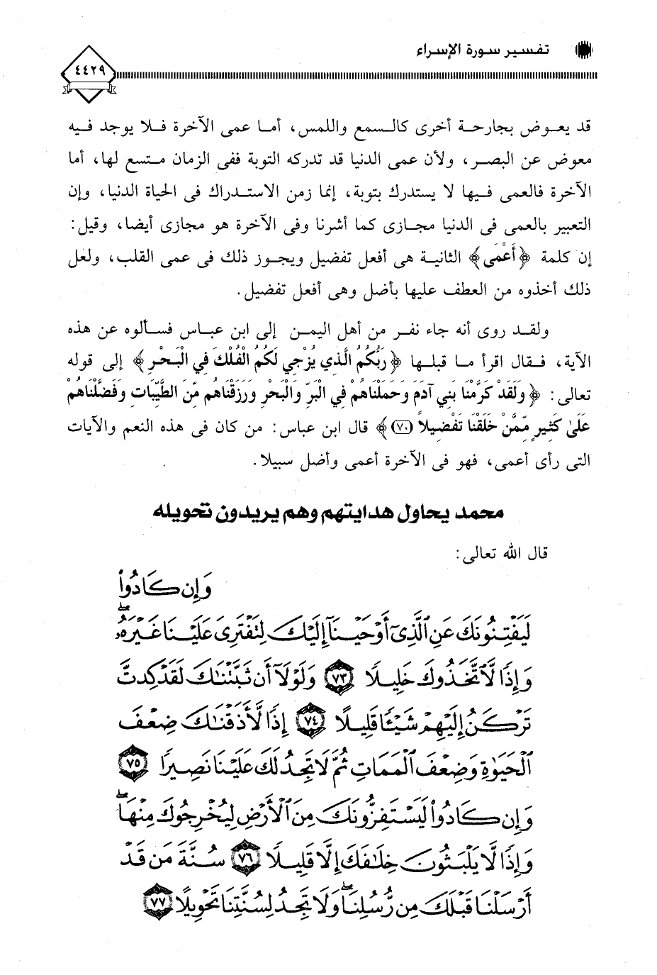(وَإِنْ كَادُوا لَيَفْتِنُونَكَ عَنِ الَّذِي أَوْحَيْنَا إِلَيْكَ لِتَفْتَرِيَ عَلَيْنَا غَيْرَهُ وَإِذًا لَاتَّخَذُوكَ خَلِيلًا (73) وَلَوْلَا أَنْ ثَبَّتْنَاكَ لَقَدْ كِدْتَ تَرْكَنُ إِلَيْهِمْ شَيْئًا قَلِيلًا (74) إِذًا لَأَذَقْنَاكَ ضِعْفَ الْحَيَاةِ وَضِعْفَ الْمَمَاتِ ثُمَّ لَا تَجِدُ لَكَ عَلَيْنَا نَصِيرًا (75) وَإِنْ كَادُوا لَيَسْتَفِزُّونَكَ مِنَ الْأَرْضِ لِيُخْرِجُوكَ مِنْهَا وَإِذًا لَا يَلْبَثُونَ خِلَافَكَ إِلَّا قَلِيلًا (76) سُنَّةَ مَنْ قَدْ أَرْسَلْنَا قَبْلَكَ مِنْ رُسُلِنَا وَلَا تَجِدُ لِسُنَّتِنَا تَحْوِيلًا (77)