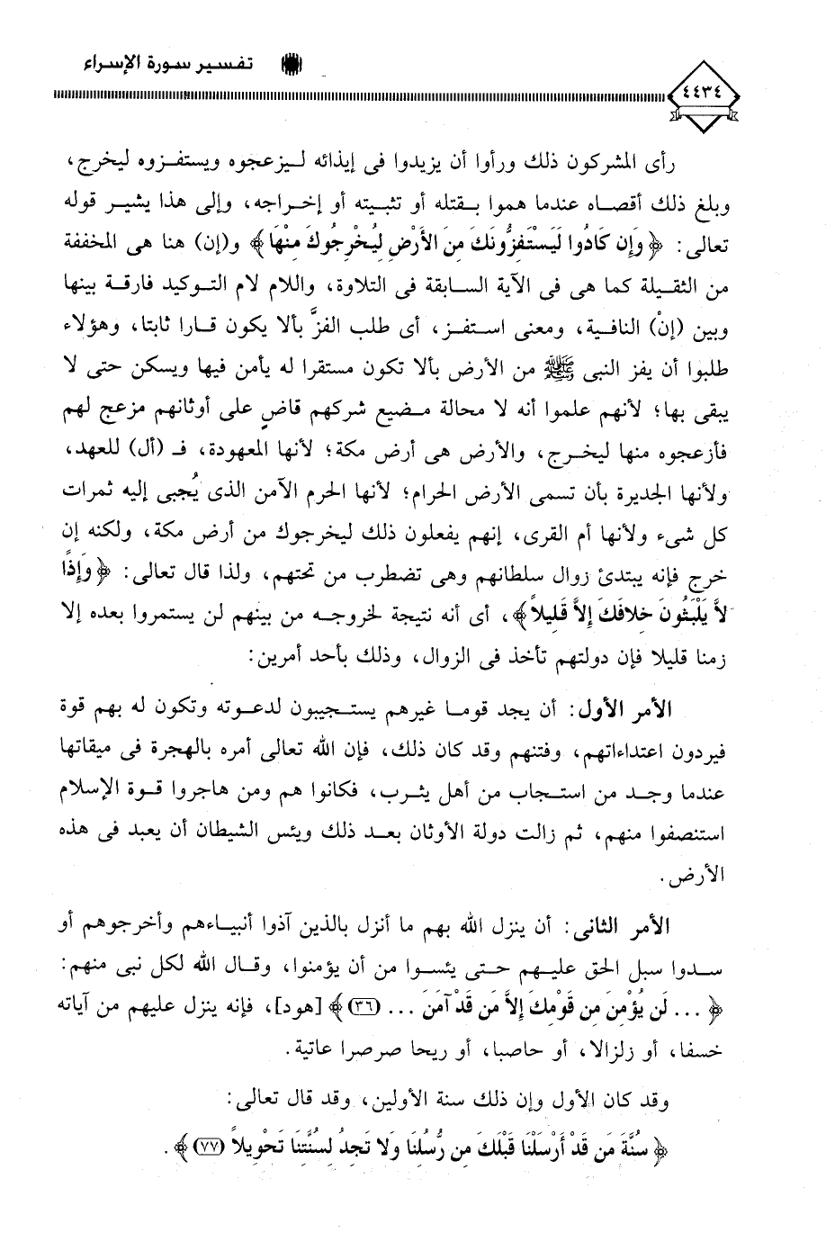 رأى المشركون ذلك ورأوا أن يزيدوا في إيذائه ليزعجوه ويستفزوه ليخرج، وبلغ ذلك أقصاه عندما هموا بقتله أو تثبيته أو إخراجه، وإلى هذا يشير قوله تعالى: (وَإِن كَادُوا لَيَسْتَفِزُّونَكَ مِنَ الأَرْضِ لِيُخْرِجُوكَ مِنْهَا) و (إن) هنا هي المخففة من الثقيلة كما هي في الآية السابقة في التلاوة، واللام لام التوكيد فارقة بينها وبين (إنْ) النافية، ومعنى استفز، أي طلب الفزَّ بألا يكون قارا ثابتا، وهؤلاء طلبوا أن يفز النبي - صلى الله عليه وسلم - من الأرض بألا تكون مستقرا له يأمن فيها ويسكن حتى لا يبقى بها؛ لأنهم علموا أنه لَا محالة مضيع شركهم قاضٍ على أوثانهم مزعج لهم فأزعجوه منها ليخرج، والأرض هي أرض مكة؛ لأنها المعهودة، فـ (أل) للعهد، ولأنها الجديرة بأن تسمى الأرض الحرام؛ لأنها الحرم الآمن الذي يُجبى إليه ثمرات كل شيء ولأنها أم القرى، إنهم يفعلون ذلك ليخرجوك من أرض مكة، ولكنه إن خرج فإنه يبتدئ زوال سلطانهم وهي تضطرب من تحتهم، ولذا قال تعالى: (وَإِذًا لَا يَلْبَثُونَ خِلافَكَ إِلَّا قَلِيلًا)، أي أنه نتيجة لخروجه من بينهم لن يستمروا بعده إلا زمنا قليلا فإن دولتهم تأخذ في الزوال، وذلك بأحد أمرين: