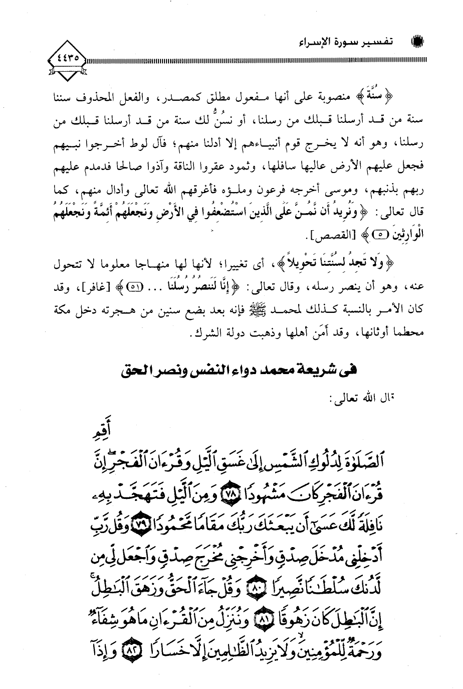 (أَقِمِ الصَّلَاةَ لِدُلُوكِ الشَّمْسِ إِلَى غَسَقِ اللَّيْلِ وَقُرْآنَ الْفَجْرِ إِنَّ قُرْآنَ الْفَجْرِ كَانَ مَشْهُودًا (78) وَمِنَ اللَّيْلِ فَتَهَجَّدْ بِهِ نَافِلَةً لَكَ عَسَى أَنْ يَبْعَثَكَ رَبُّكَ مَقَامًا مَحْمُودًا (79) وَقُلْ رَبِّ أَدْخِلْنِي مُدْخَلَ صِدْقٍ وَأَخْرِجْنِي مُخْرَجَ صِدْقٍ وَاجْعَلْ لِي مِنْ لَدُنْكَ سُلْطَانًا نَصِيرًا (80) وَقُلْ جَاءَ الْحَقُّ وَزَهَقَ الْبَاطِلُ إِنَّ الْبَاطِلَ كَانَ زَهُوقًا (81) وَنُنَزِّلُ مِنَ الْقُرْآنِ مَا هُوَ شِفَاءٌ وَرَحْمَةٌ لِلْمُؤْمِنِينَ وَلَا يَزِيدُ الظَّالِمِينَ إِلَّا خَسَارًا (82)