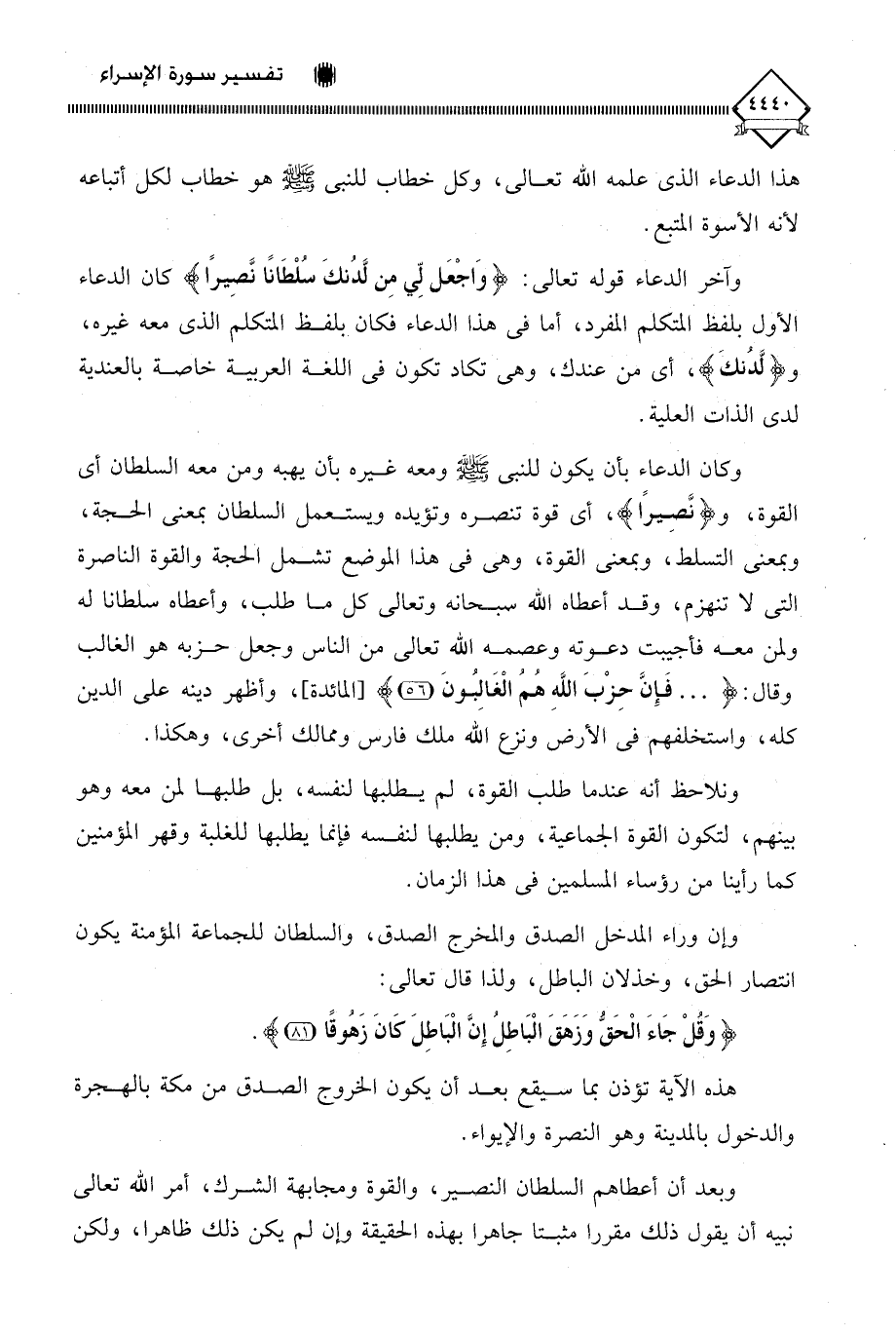 وكان الدعاء بأن يكون للنبي - صلى الله عليه وسلم - ومعه غيره بأن يهبه ومن معه السلطان أي القوة، و (نَّصِيرًا)، أي قوة تنصره وتؤيده ويستعمل السلطان بمعنى الحجة، وبمعنى التسلط، وبمعنى القوة، وهي في هذا الموضع تشمل الحجة والقوة الناصرة التي لَا تنهزم، وقد أعطاه اللَّه سبحانه وتعالى كل ما طلب، وأعطاه سلطانا له ولمن معه فأجيبت دعوته وعصمه اللَّه تعالى من الناس وجعل حزبه هو الغالب وقال: (. . . فَإِنَّ حِزْبَ اللَّهِ هُمُ الْغَالِبُونَ)، وأظهر دينه على الدين كله، واستخلفهم في الأرض ونزع اللَّه ملك فارس وممالك أخرى، وهكذا.