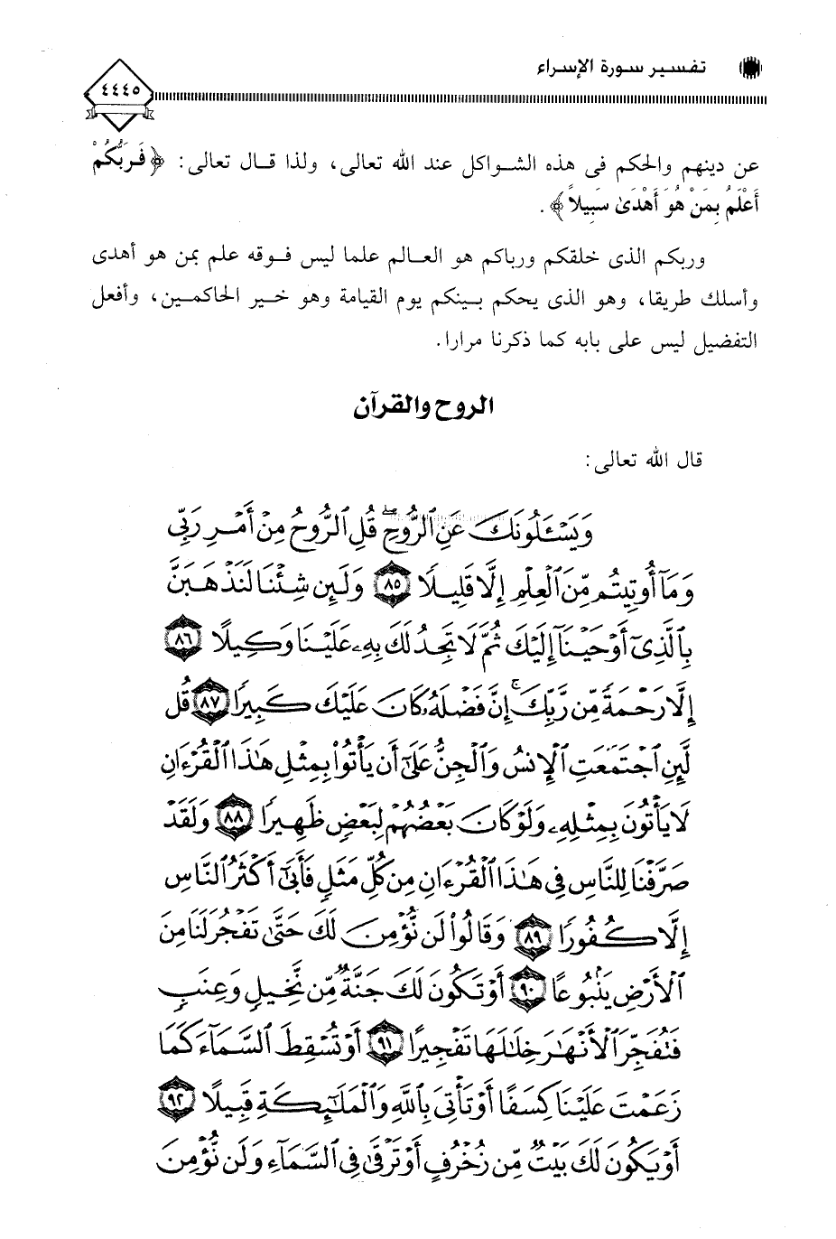 (وَيَسْأَلُونَكَ عَنِ الرُّوحِ قُلِ الرُّوحُ مِنْ أَمْرِ رَبِّي وَمَا أُوتِيتُمْ مِنَ الْعِلْمِ إِلَّا قَلِيلًا (85) وَلَئِنْ شِئْنَا لَنَذْهَبَنَّ بِالَّذِي أَوْحَيْنَا إِلَيْكَ ثُمَّ لَا تَجِدُ لَكَ بِهِ عَلَيْنَا وَكِيلًا (86) إِلَّا رَحْمَةً مِنْ رَبِّكَ إِنَّ فَضْلَهُ كَانَ عَلَيْكَ كَبِيرًا (87) قُلْ لَئِنِ اجْتَمَعَتِ الْإِنْسُ وَالْجِنُّ عَلَى أَنْ يَأْتُوا بِمِثْلِ هَذَا الْقُرْآنِ لَا يَأْتُونَ بِمِثْلِهِ وَلَوْ كَانَ بَعْضُهُمْ لِبَعْضٍ ظَهِيرًا (88) وَلَقَدْ صَرَّفْنَا لِلنَّاسِ فِي هَذَا الْقُرْآنِ مِنْ كُلِّ مَثَلٍ فَأَبَى أَكْثَرُ النَّاسِ إِلَّا كُفُورًا (89) وَقَالُوا لَنْ نُؤْمِنَ لَكَ حَتَّى تَفْجُرَ لَنَا مِنَ الْأَرْضِ يَنْبُوعًا (90) أَوْ تَكُونَ لَكَ جَنَّةٌ مِنْ نَخِيلٍ وَعِنَبٍ فَتُفَجِّرَ الْأَنْهَارَ خِلَالَهَا تَفْجِيرًا (91) أَوْ تُسْقِطَ السَّمَاءَ كَمَا زَعَمْتَ عَلَيْنَا كِسَفًا أَوْ تَأْتِيَ بِاللَّهِ وَالْمَلَائِكَةِ قَبِيلًا (92) أَوْ يَكُونَ لَكَ بَيْتٌ مِنْ زُخْرُفٍ أَوْ تَرْقَى فِي السَّمَاءِ وَلَنْ نُؤْمِنَ