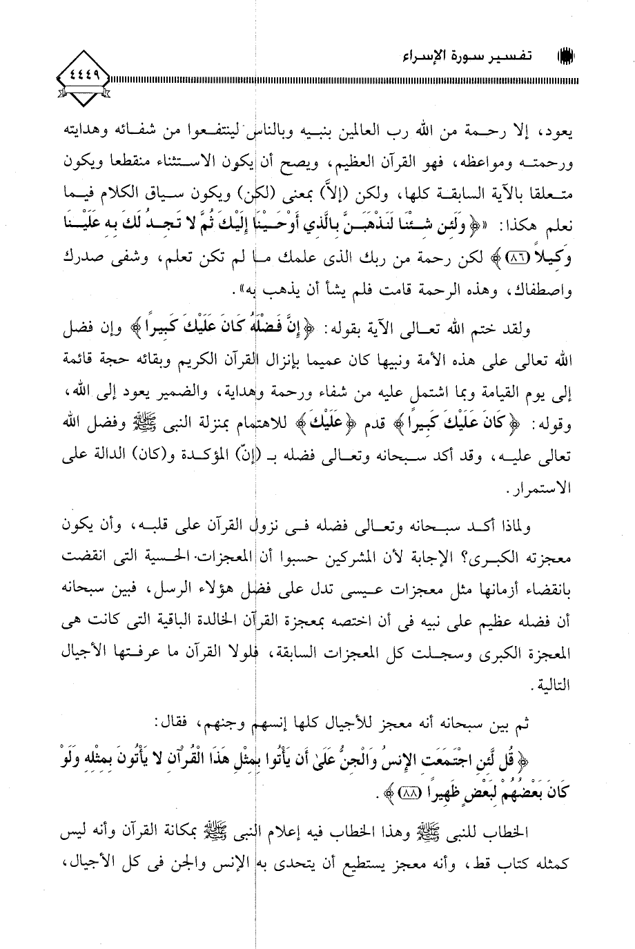 ولقد ختم اللَّه تعالى الآية بقوله: (إِنَّ فَضْلَهُ كَانَ عَلَيْكَ كَبِيرًا) وإن فضل اللَّه تعالى على هذه الأمة ونبيها كان عميما بإنزال القرآن الكريم وبقائه حجة قائمة إلى يوم القيامة وبما اشتمل عليه من شفاء ورحمة وهداية، والضمير يعود إلى اللَّه، وقوله: (كَانَ عَلَيْكَ كَبِيرًا) قدم (عَلَيْكَ) للاهتيام بمنزلة النبي - صلى الله عليه وسلم - وفضل اللَّه تعالى عليه، وقد أكد سبحانه وتعالى فضله بـ (إنَّ) المؤكدة و (كان) الدالة على الاستمرار.