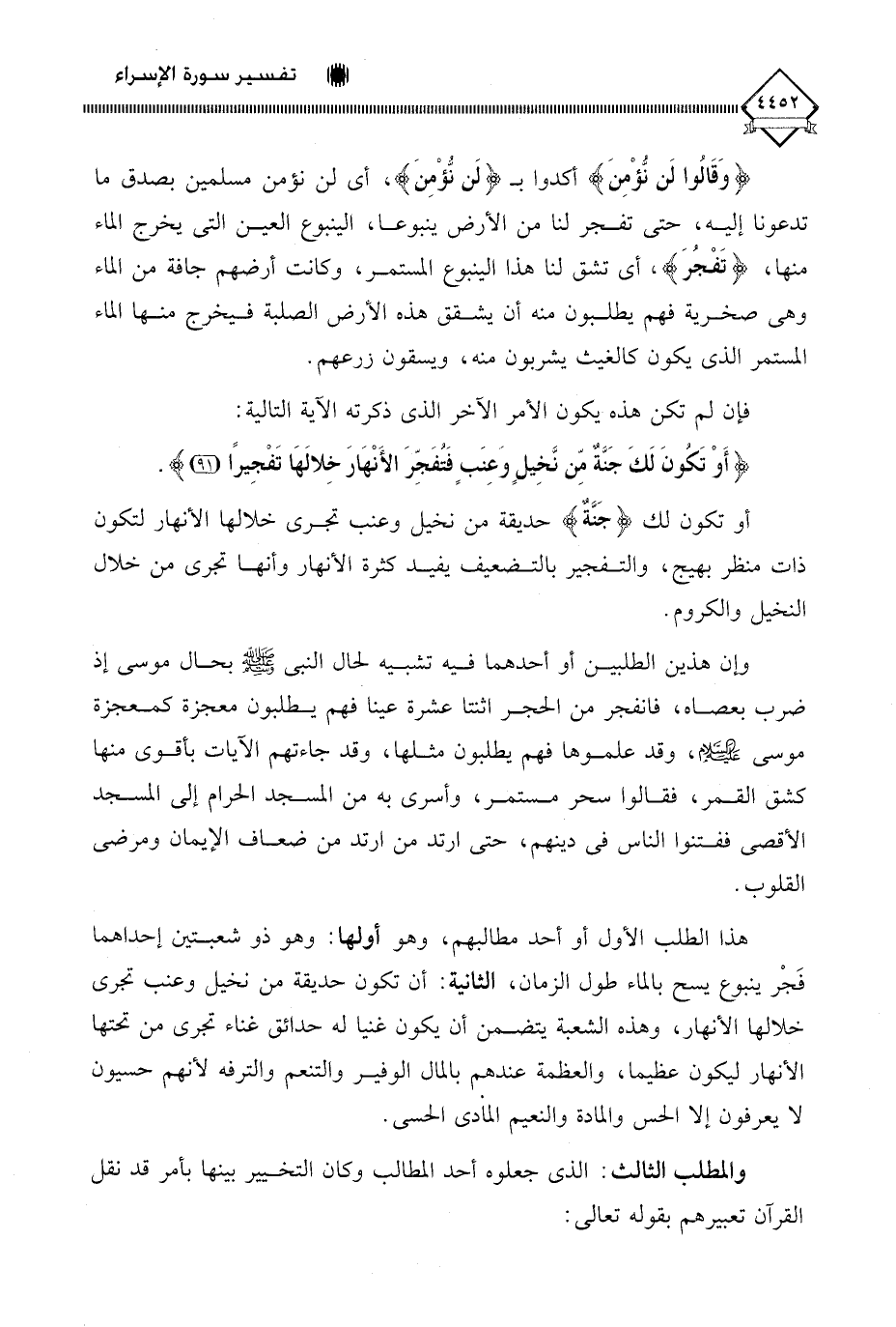 هذا الطلب الأول أو أحد مطالبهم، وهو أولها: وهو ذو شعبتين إحداهما فَجْر ينبوع يسح بالماء طول الزمان، الثانية: أن تكون حديقة من نخيل وعنب تجري خلالها الأنهار، وهذه الشعبة يتضمن أن يكون غنيا له حدائق غناء تجري من تحتها الأنهار ليكون عظيما، والعظمة عندهم بالمال الوفير والتنعم والترفه لأنهم حسيون لا يعرفون إلا الحس والمادة والنعيم المادي الحسي.