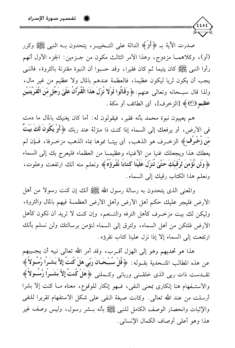 والمعنى الذي يتحدون به رسالة رسول اللَّه - صلى الله عليه وسلم - أنك إن كنت رسولا من أهل الأرض فليجر عليك حكم أهل الأرض وأهل الأرض العظمة فيهم بالمال والثروة، وليكن لك بيت مزخرف كأهل الترفه والتنعم، وإن كنت لَا تريد أن تكون كأهل الأرض فلتكن من أهل السماء، ولترق إلى السماء لنؤمن برسالتك ولن نسلم بأنك ارتفعت إلى السماء إلا إذا نزل علينا كتاب نقرؤه.