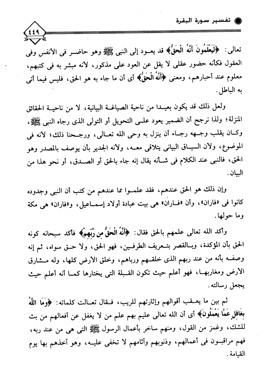 ولعل ذلك قد يكون بعيدا من ناحية الصياغة البيانية، لَا من ناحية الحقائق المنزلة؛ ولذا نرجح أن الضمير يعود على التحويل أو التولي الذي رجاه النبي - صلى الله عليه وسلم -، وكان يقلب وجهه رجاء أن ينزل به وحي الله تعالى، ورجحنا ذلك؛ لأنه في الموضوع، ولأن السياق البياني يتلاقى معه، ولأنه الجدير بأن يوصف بالمصدر وهو الحق، فالنبي عند الكلام في شأنه يقال إنه جاء بالحق أو الصدق، أو نحو هذا من البيان.