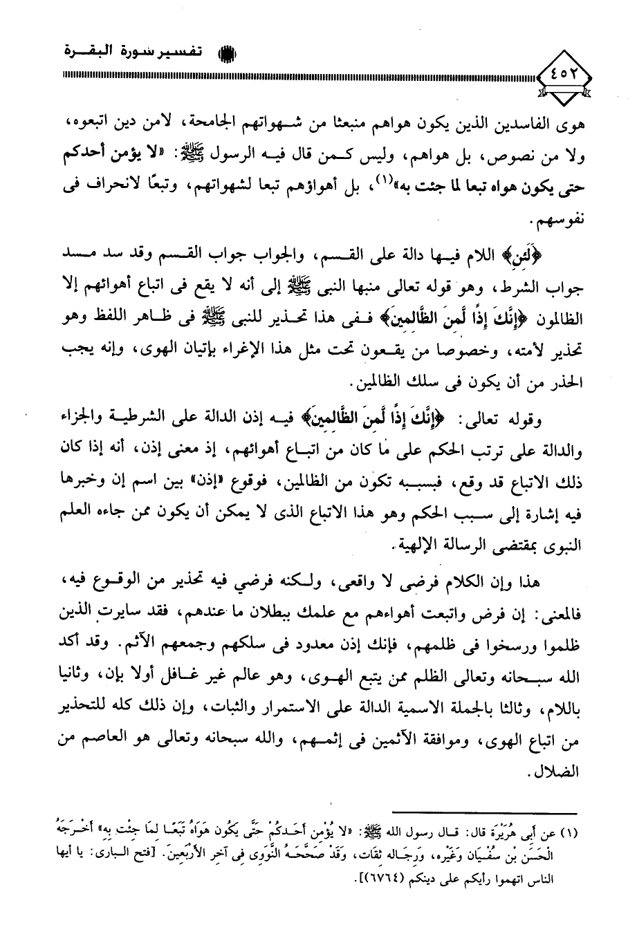 (¬1) عن أبِى هُرَيْرَة قال: قال رسول الله - صلى الله عليه وسلم -: " لا يُؤْمِن أحَدكُمْ حَتَّى يكون هَوَاهُ تَبَعًا لِمَا جِئْت بِهِ " أخْرَجَهُ الْحَسَن بْن سُفْيَان وَغَيْره، وَرِجَاله ثِقَات، وَقَدْ صَحَّحَهُ النَوَوِى فِى آخِر الأرْبَعِينَ. [فتح الباري: يا أيها الناس اتهموا رأيكم على دينكم (6764)].