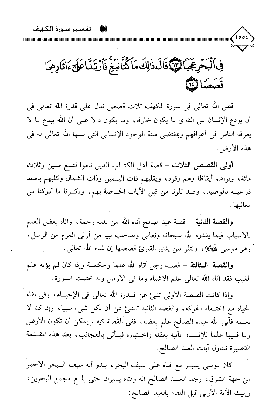 والقصة الثانية - قصة عبد صالح آتاه اللَّه من لدنه رحمة، وآتاه بعض العلم بالأسباب فيما يقدره اللَّه سبحانه وتعالى وصاحب نبيا من أولي العزم من الرسل، وهو موسى - عليه السلام -، ونتلو بين يدي القارئ قصصها إن شاء اللَّه تعالى.