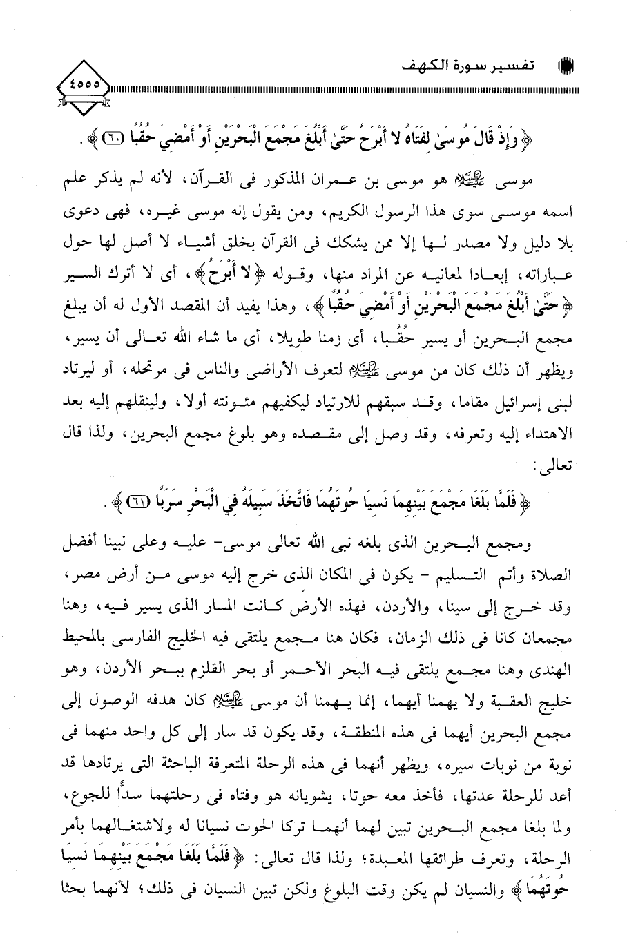 ومجمع البحرين الذي بلغه نبي اللَّه تعالى موسى - عليه وعلى نبينا أفضل الصلاة وأتم التسليم - يكون في المكان الذي خرج إليه موسى من أرض مصر، وقد خرج إلى سينا، والأردن، فهذه الأرض كانت المسار الذي يسير فيه، وهنا مجمعان كانا في ذلك الزمان، فكان هنا مجمع يلتقي فيه الخليج الفارسي بالمحيط الهندي وهنا مجمع يلتقى فيه البحر الأحمر أو بحر القلزم ببحر الأردن، وهو خليج العقبة ولا يهمنا أيهما، إنما يهمنا أن موسى - عليه السلام - كان هدفه الوصول إلى مجمع البحرين أيهما في هذه المنطقة، وقد يكون قد سار إلى كل واحد منهما في نوبة من نوبات سيره، ويظهر أنهما في هذه الرحلة المتعرفة الباحثة التي يرتادها قد أعد للرحلة عدتها، فأخذ معه حوتا، يشويانه هو وفتاه في رحلتهما سدًّا للجوع، ولما بلغا مجمع البحرين تبين لهما أنهما تركا الحوت نسيانا له ولاشتغالهما بأمر الرحلة، وتعرف طرائقها المعبدة، ولذا قال تعالى: (فَلَمَّا بَلَغَا مجْمَعَ بَيْنِهِمَا نَسِيَا حُوتَهُمَا) والنسيان لم يكن وقت البلوغ ولكن تبين النسيان في ذلك، لأنهما بحثا
