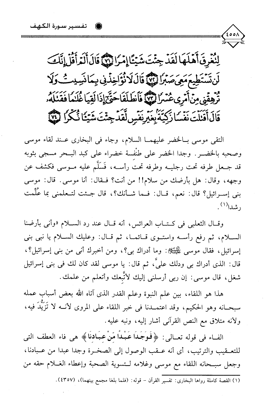هذا هو اللقاء، بين علم النبوة وعلم القدر الذي آتاه اللَّه بعض أسباب عمله سبحانه وهو الحكيم، وقد اعتمدنا في خبر اللقاء على المروي لأنه لَا تَزَيُّدَ فيه، ولأنه متلاق مع النص القرآني أشار إليه، ونبه عليه.