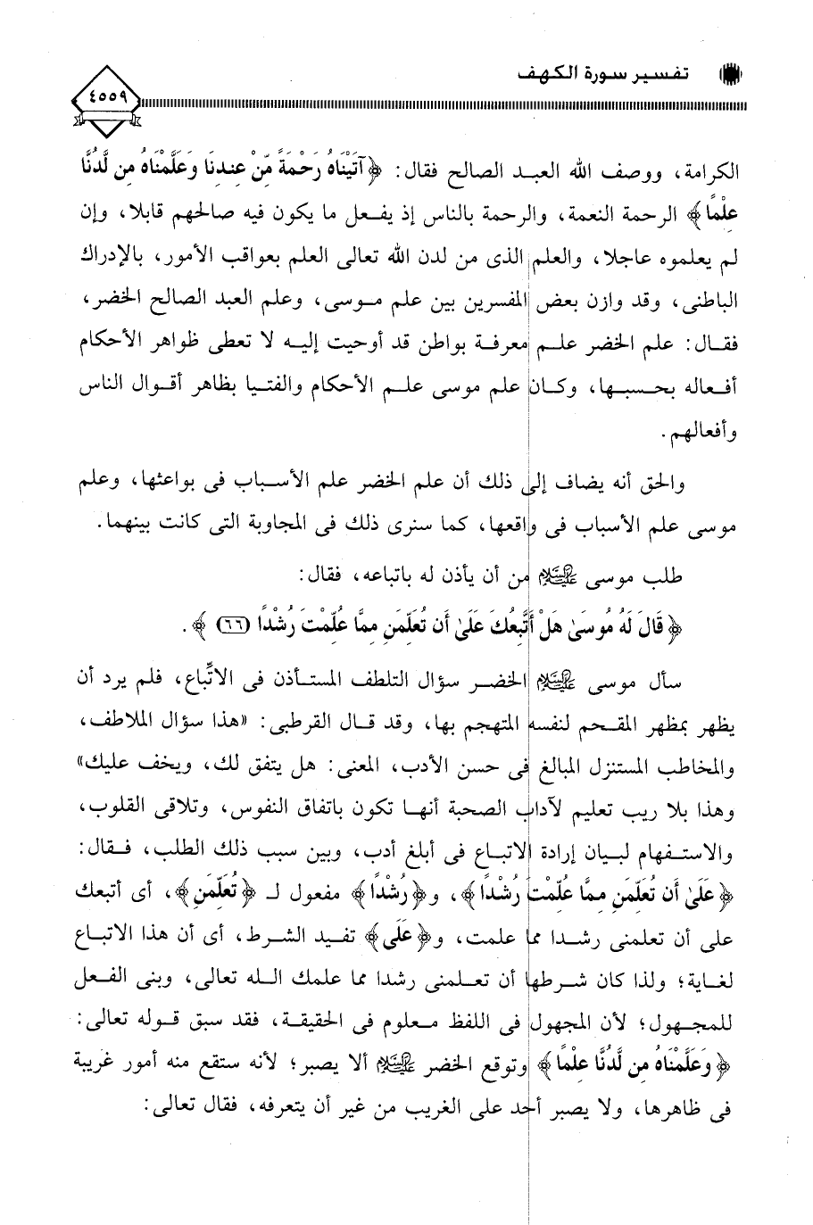الكرامة، ووصف اللَّه العبد الصالح قال: (آتَيْنَاهُ رَحْمَةً مِّنْ عِندِنَا وَعَلَّمْنَاهُ مِن لَّدُنَّا عِلْمًا) الرحمة النعمة، والرحمة بالناس إذ يفعل ما يكون فيه صالحهم قابلا، وإن لم يعلموه عاجلا، والعلم الذي من لدن اللَّه تعالى العلم بعواقب الأمور، بالإدراك الباطني، وقد وازن بعض المفسرين بين علم موسى، وعلم العبد الصالح الخضر، فقال: علم الخضر علم معرفة بواطن قد أوحيت إليه لَا تعطى ظواهر الأحكام أفعاله بحسبها، وكان علم موسى علم الأحكام والفتيا بظاهر أقوال الناس وأفعالهم.