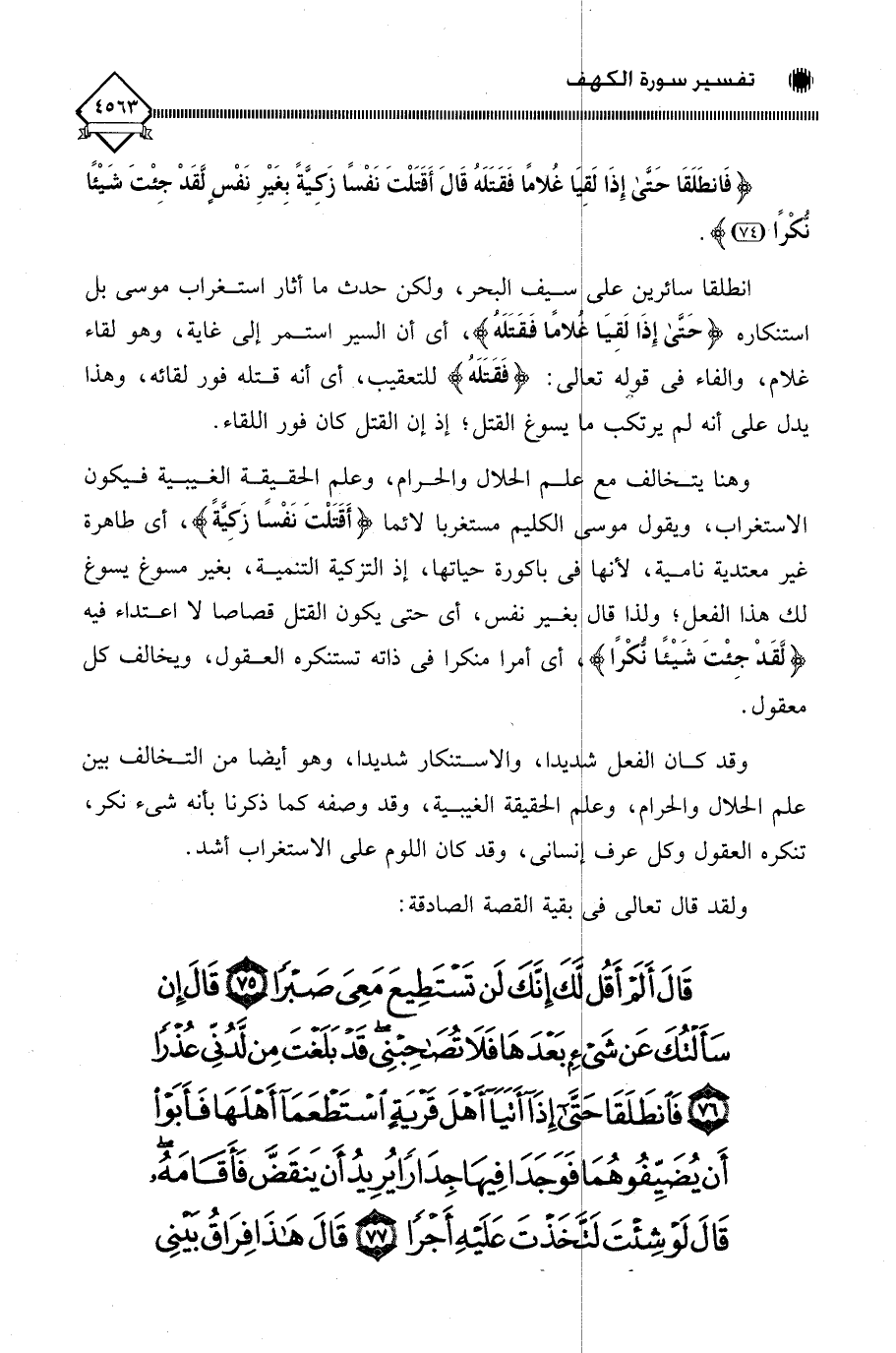 (فَانْطَلَقَا حَتَّى إِذَا لَقِيَا غُلَامًا فَقَتَلَهُ قَالَ أَقَتَلْتَ نَفْسًا زَكِيَّةً بِغَيْرِ نَفْسٍ لَقَدْ جِئْتَ شَيْئًا نُكْرًا (74)