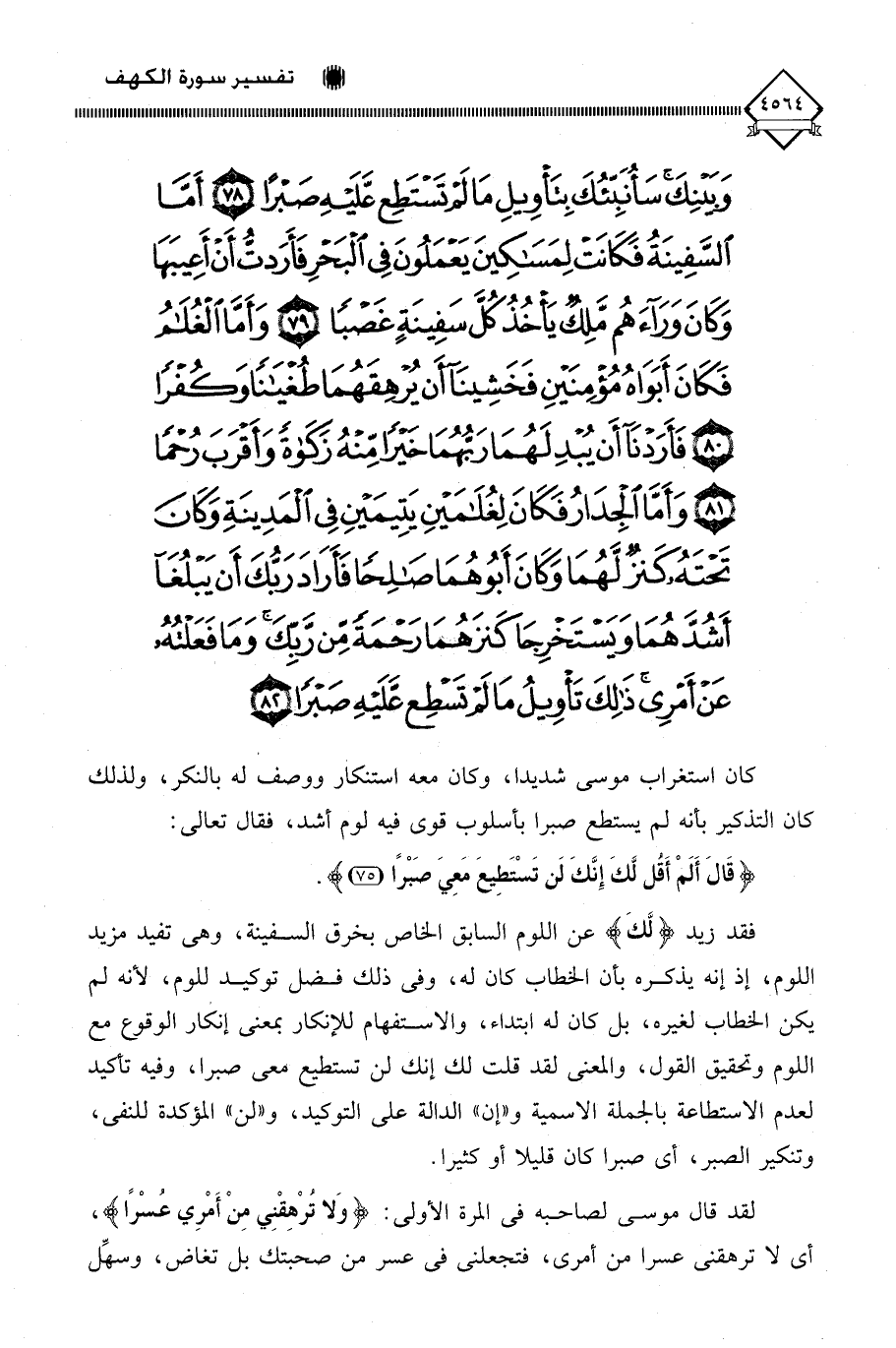 وَبَيْنِكَ سَأُنَبِّئُكَ بِتَأْوِيلِ مَا لَمْ تَسْتَطِعْ عَلَيْهِ صَبْرًا (78) أَمَّا السَّفِينَةُ فَكَانَتْ لِمَسَاكِينَ يَعْمَلُونَ فِي الْبَحْرِ فَأَرَدْتُ أَنْ أَعِيبَهَا وَكَانَ وَرَاءَهُمْ مَلِكٌ يَأْخُذُ كُلَّ سَفِينَةٍ غَصْبًا (79) وَأَمَّا الْغُلَامُ فَكَانَ أَبَوَاهُ مُؤْمِنَيْنِ فَخَشِينَا أَنْ يُرْهِقَهُمَا طُغْيَانًا وَكُفْرًا (80) فَأَرَدْنَا أَنْ يُبْدِلَهُمَا رَبُّهُمَا خَيْرًا مِنْهُ زَكَاةً وَأَقْرَبَ رُحْمًا (81) وَأَمَّا الْجِدَارُ فَكَانَ لِغُلَامَيْنِ يَتِيمَيْنِ فِي الْمَدِينَةِ وَكَانَ تَحْتَهُ كَنْزٌ لَهُمَا وَكَانَ أَبُوهُمَا صَالِحًا فَأَرَادَ رَبُّكَ أَنْ يَبْلُغَا أَشُدَّهُمَا وَيَسْتَخْرِجَا كَنْزَهُمَا رَحْمَةً مِنْ رَبِّكَ وَمَا فَعَلْتُهُ عَنْ أَمْرِي ذَلِكَ تَأْوِيلُ مَا لَمْ تَسْطِعْ عَلَيْهِ صَبْرًا (82)