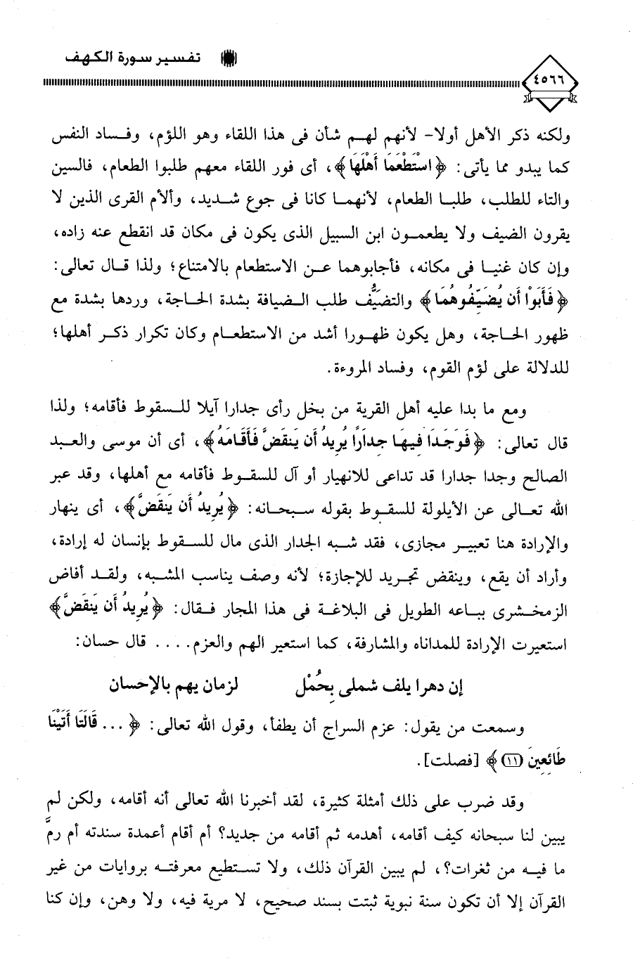 ومع ما بدا عليه أهل القرية من بخل رأى جدارا آيلا للسقوط فأقامه؛ ولذا قال تعالى: (فَوَجَدَا فِيهَا جِدَارًا يُرِيدُ أَنْ يَنْقَضَّ فَأَقَامَهُ)، أي أن موسى والعبد الصالح وجدا جدارا قد تداعي للانهيار أو آل للسقوط فأقامه مع أهلها، وقد عبر اللَّه تعالى عن الأيلولة للسقوط بقوله سبحانه: (يُرِيدُ أَن ينقَضَّ)، أي ينهار والإرادة هنا تعبير مجازي، فقد شبه الجدار الذي مال للسقوط بإنسان له إرادة، وأراد أن يقع، وينقض تجريد للإجازة؛ لأنه وصف يناسب المشبه، ولقد أفاض الزمخشري بباعه الطويل في البلاغة في هذا المجار فقال: (يُرِيدُ أَن يَنقَضَّ) استعيرت الإرادة للمداناه والمشارفة، كما استعير الهم والعزم. . . . قال حسان: