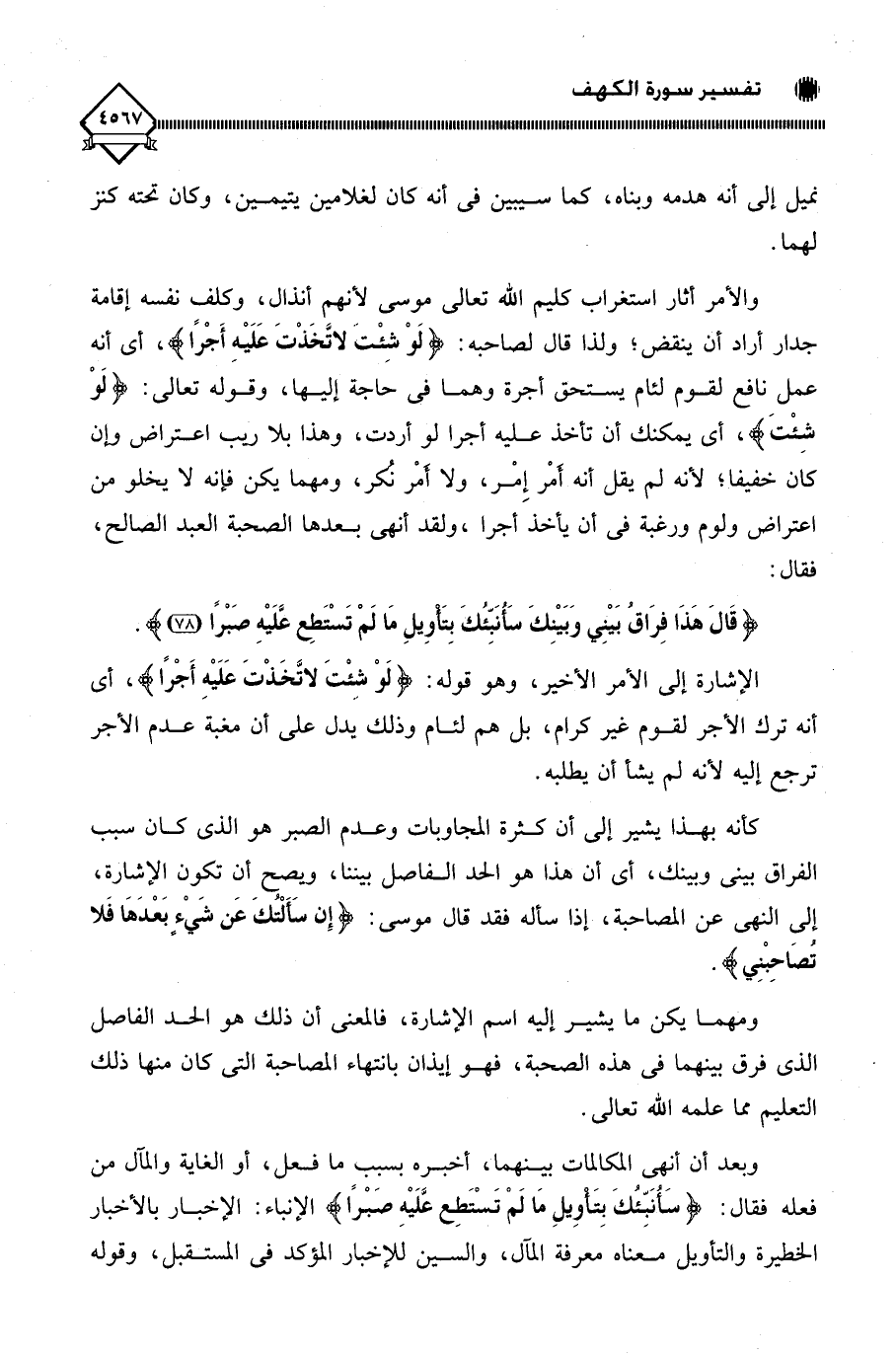 نميل إلى أنه هدمه وبناه، كما سيبين في أنه كان لغلامين يتيمين، وكان تحته كنز والأمر أثار استغراب كليم اللَّه تعالى موسى لأنهم أنذال، وكلف نفسه إقامة جدار أراد أن ينقض؛ ولذا قال لصاحبه: (لَوْ شِئْتَ لاتَّخَذْتَ عَلَيْهِ أَجْرًا)، أي أنه عمل نافع لقوم لئام يستحق أجرة وهما في حاجة إليها، وقوله تعالى: (لَوْ شِئتَ)، أي يمكنك أن تأخذ عليه أجرا لو أردت، وهذا بلا ريب اعتراض وإن كان خفيفا؛ لأنه لم يقل أنه أَمْر إِمْر، ولا أَمْر نُكر، ومهما يكن فإنه لَا يخلو من اعتراض ولوم ورغبة في أن يأخذ أجرا، ولقد أنهى بعدها الصحبة العبد الصالح، فقال: