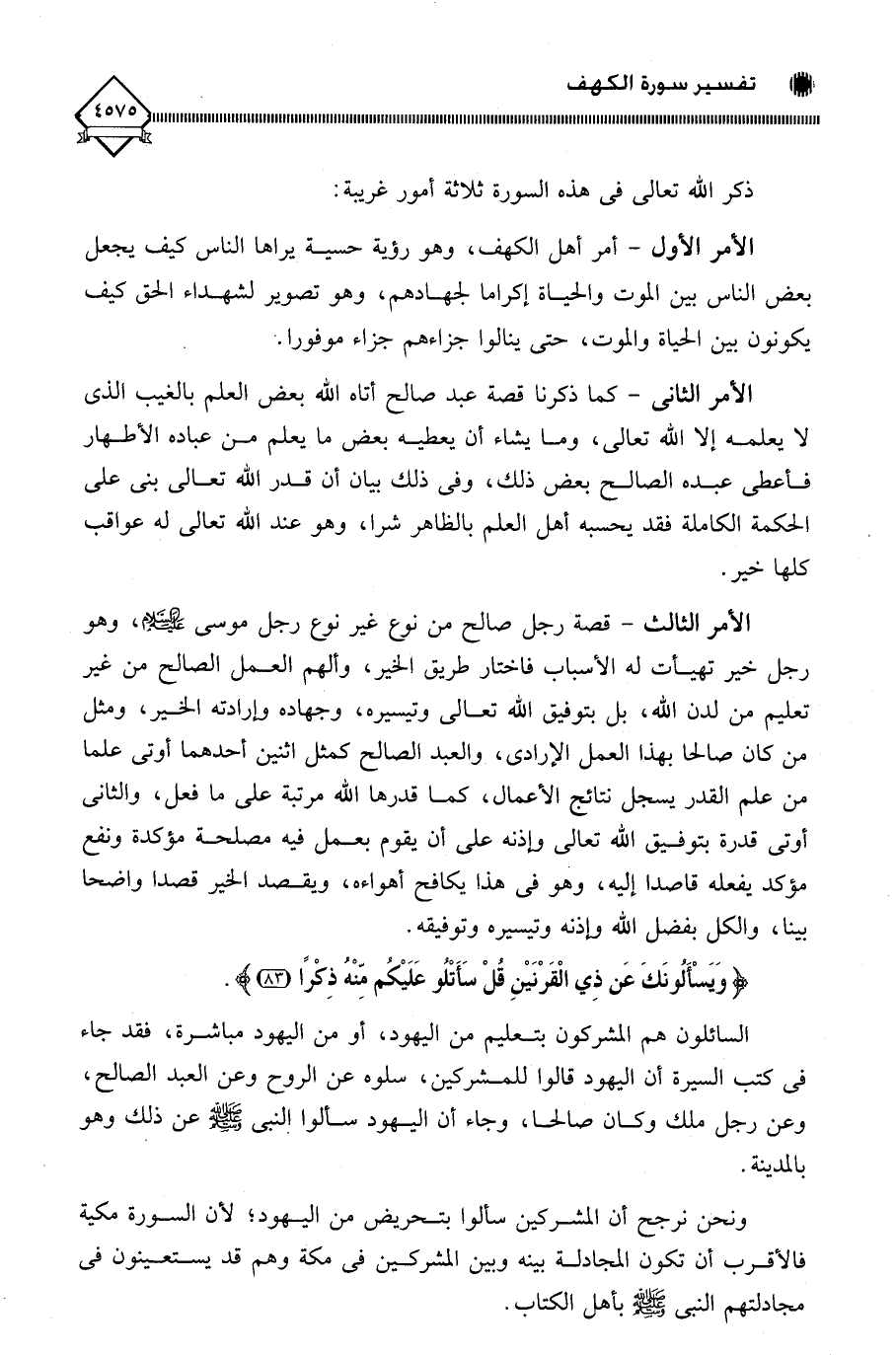 الأمر الأول - أمر أهل الكهف، وهو رؤية حسية يراها الناس كيف يجعل بعض الناس بين الموت والحياة إكراما لجهادهم، وهو تصوير لشهداء الحق كيف يكونون بين الحياة والموت، حتى ينالوا جزاءهم جزاء موفورا.