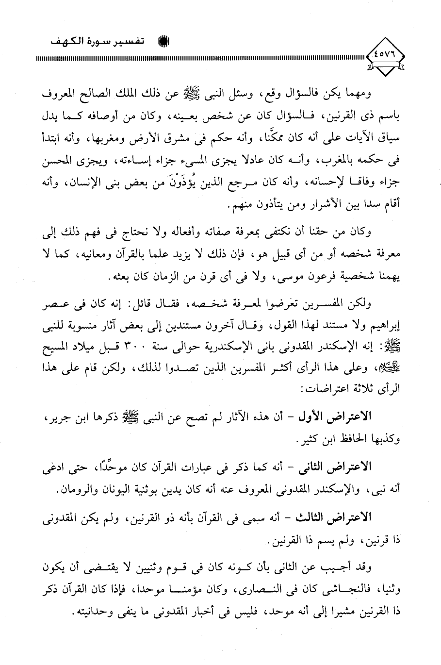 وقد أجيب عن الثاني بأن كونه كان في قوم وثنيين لَا يقتضي أن يكون وثنيا، فالنجاشي كان في النصارى، وكان مؤمنا موحدا، فإذا كان القرآن ذكر ذا القرنين مشيرا إلى أنه موحد، فليس في أخبار المقدوني ما ينفي وحدانيته.